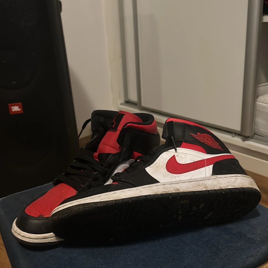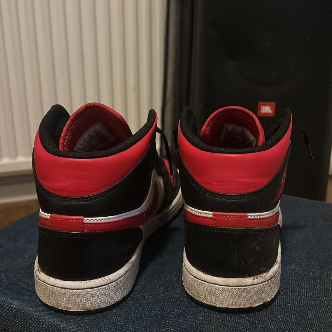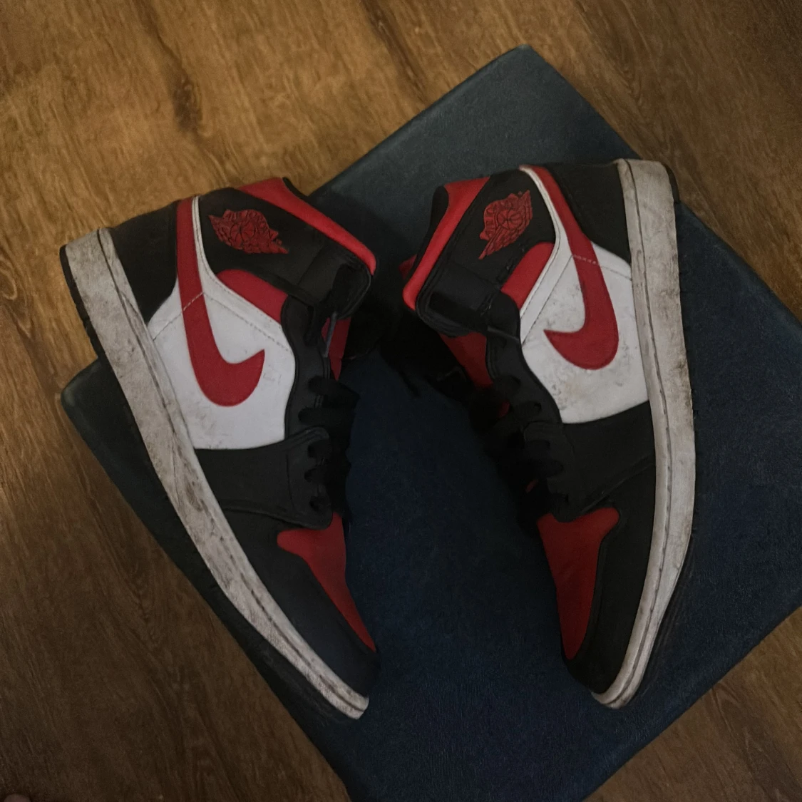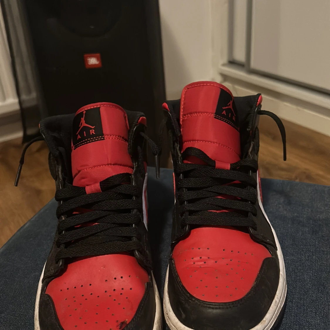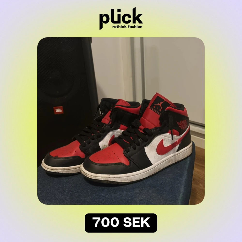Säljer ett par klassiska Nike Air Jordans i rött, svart och vitt. Skorna har en snygg design med snörning och är i bra skick. Perfekta för både vardag och fest! De har en cool retrostil som aldrig går ur tiden. Skorna är även lite smutsiga men jag tvättar dom innan jag säljer dem.