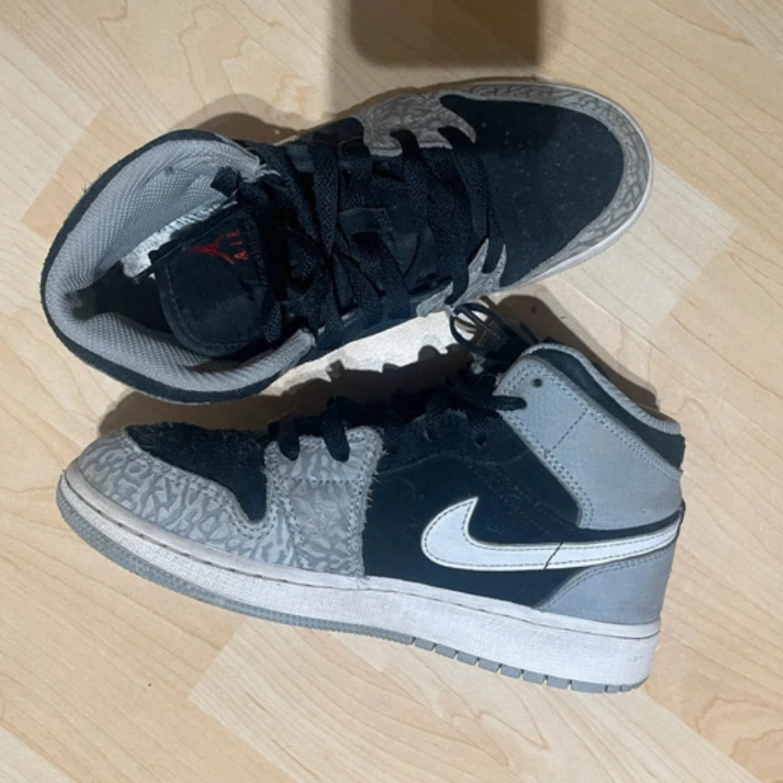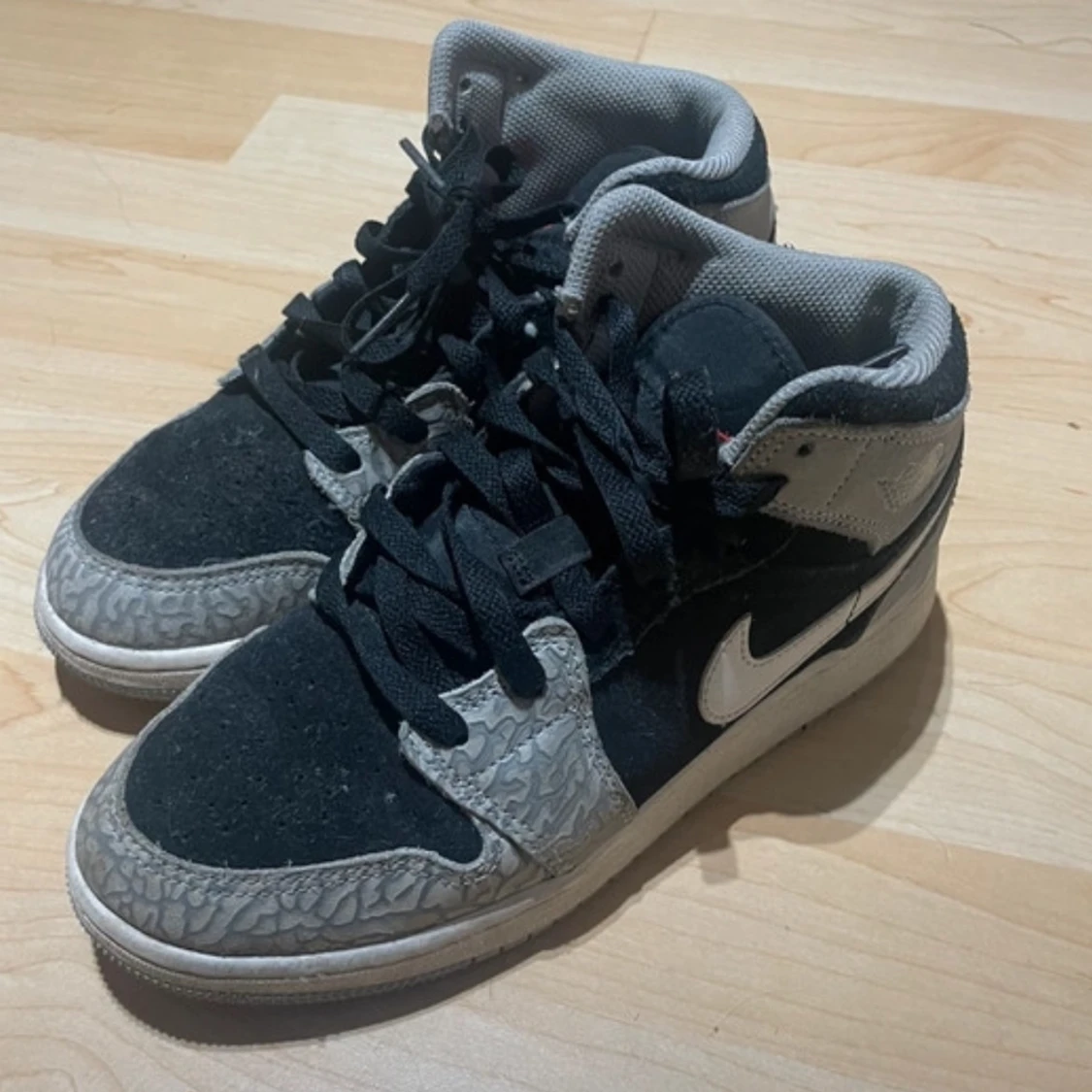 Snygga Nike Air Jordans i svart och grått med vit sula och klassisk snörning. Skorna har ett unikt mönster på gråa partier och en vit Nike-logga på sidan. Perfekta för en stilren look.