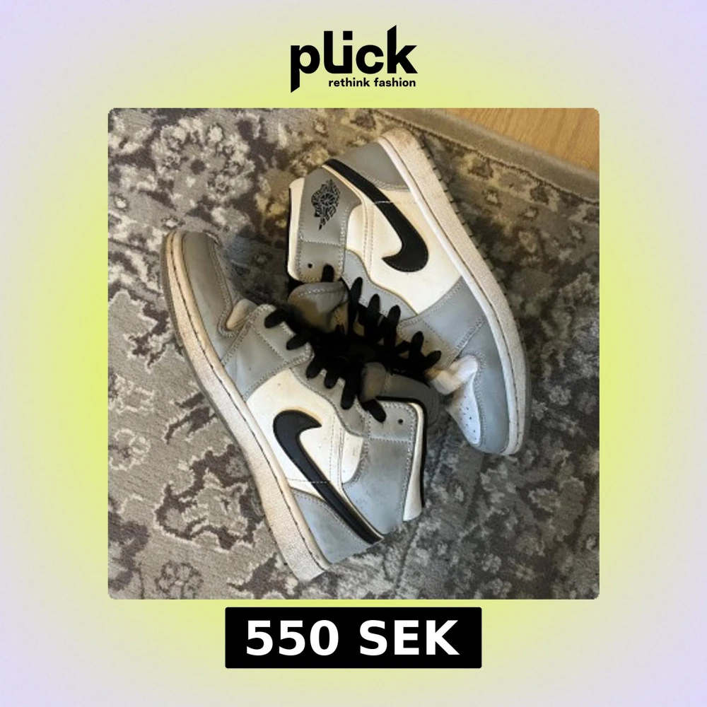 Säljer ett par klassiska Nike Air Jordans i vitt och ljusgrått med svarta detaljer och svart swoosh. Skorna har svart snörning, hög modell och rund tå. Perfekta för dig som gillar streetwear och sneakers med ikonisk design.