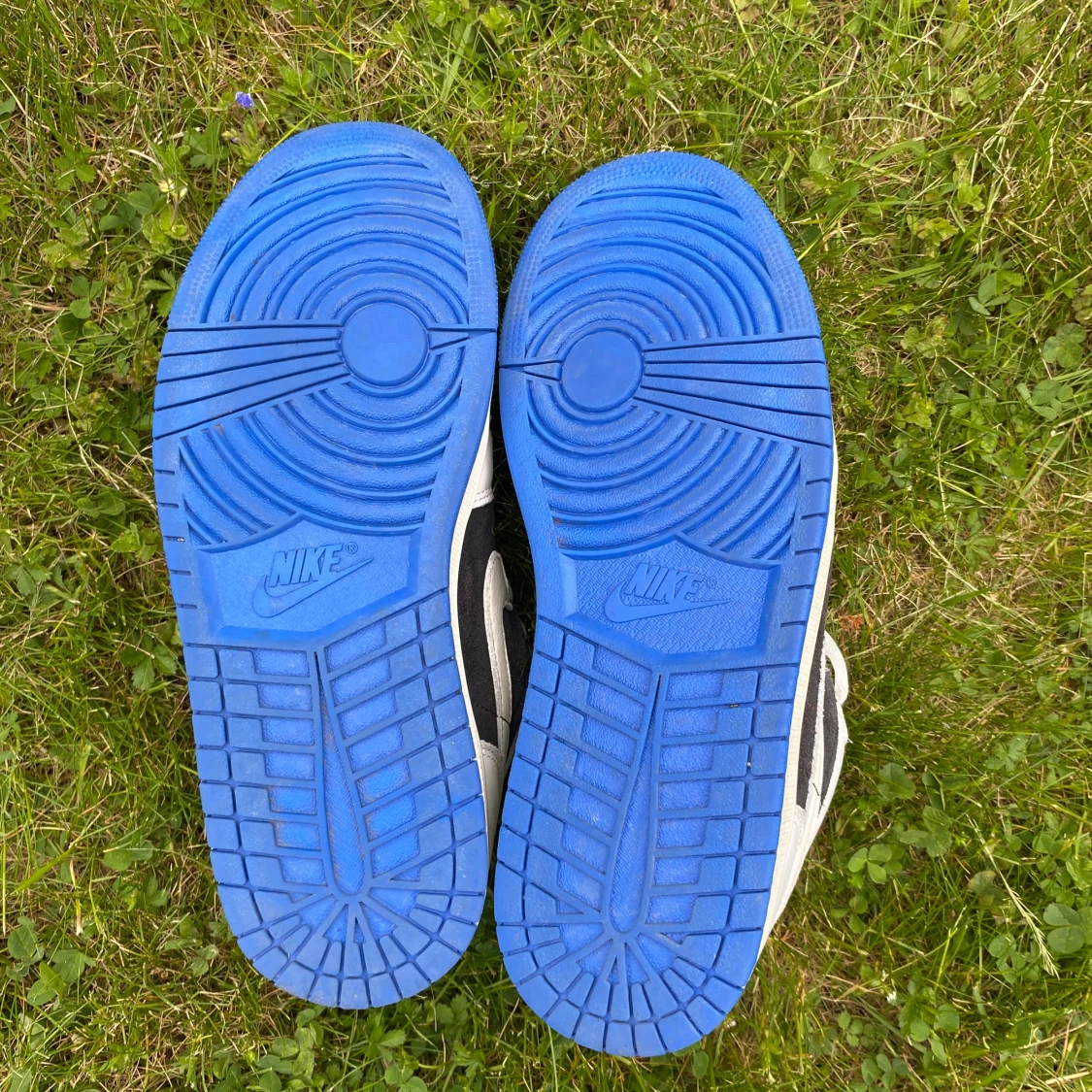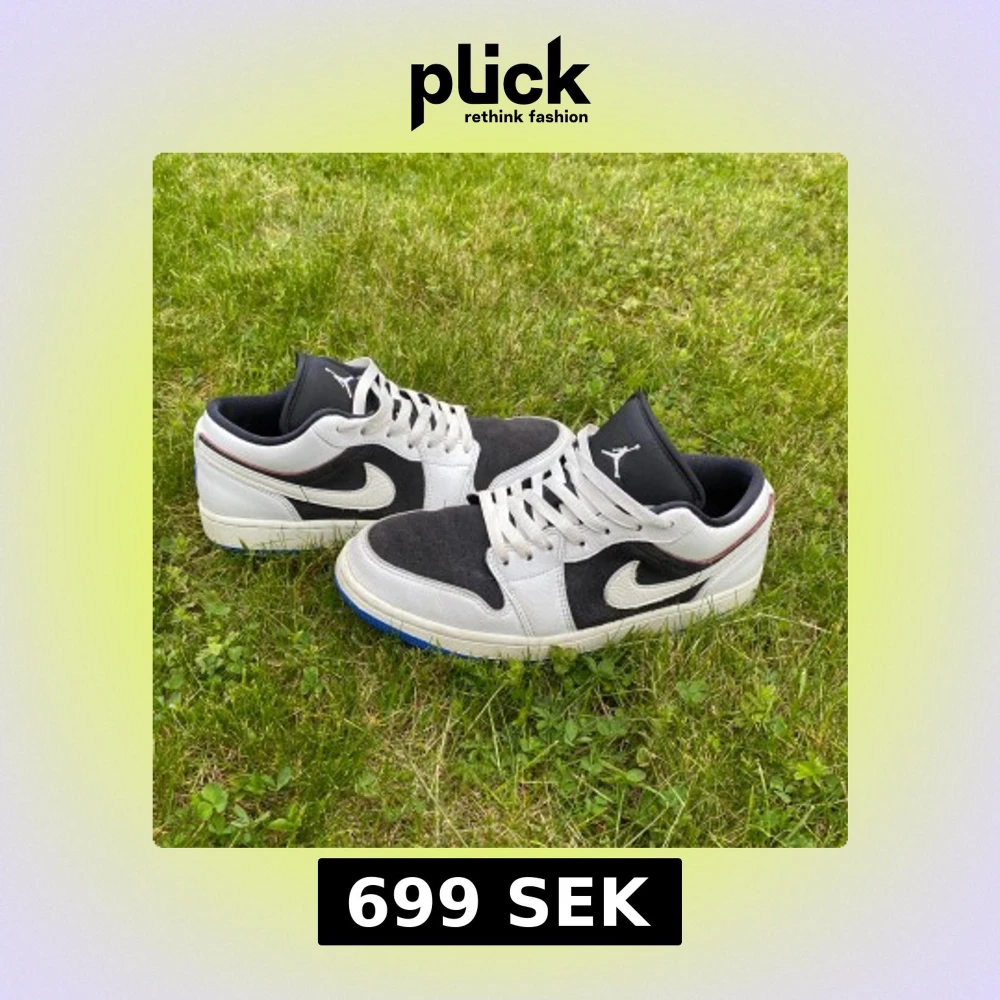 Säljer ett par Nike Air Jordans Low Quai med svart och vit ovandel, blå yttersula och klassisk swoosh. Skorna har snörning och rund tå, och levereras med originalkartong. Perfekta för dig som vill sticka ut med en ikonisk sneaker.