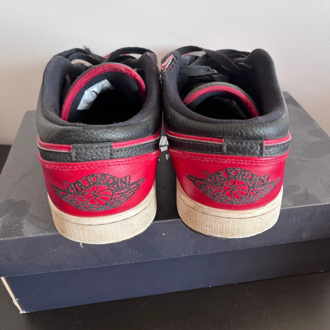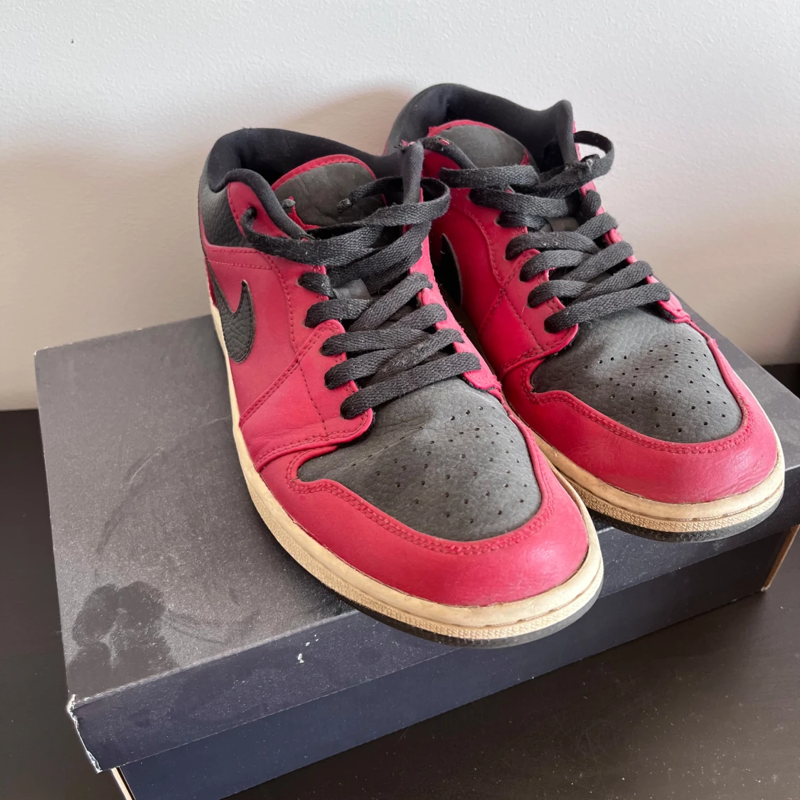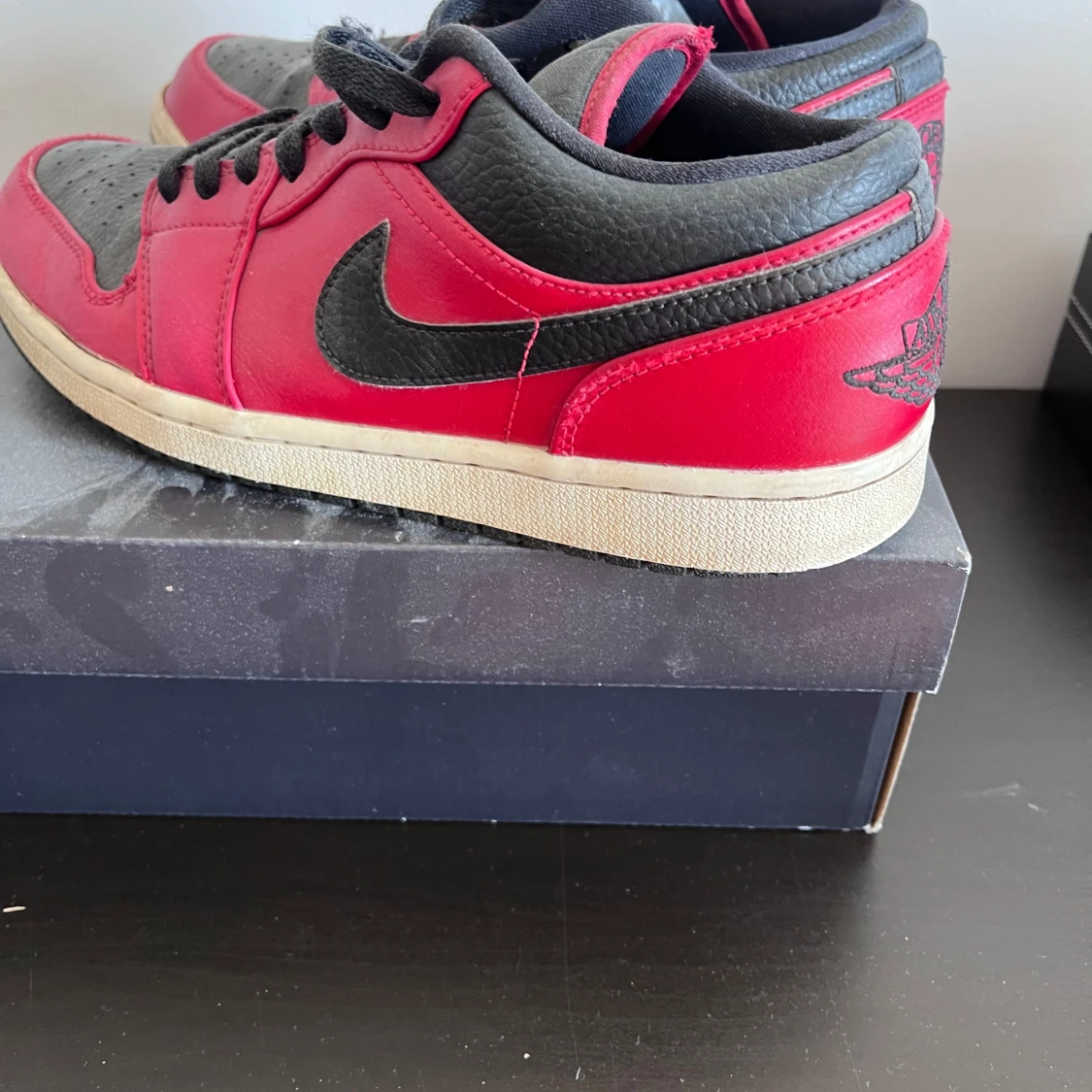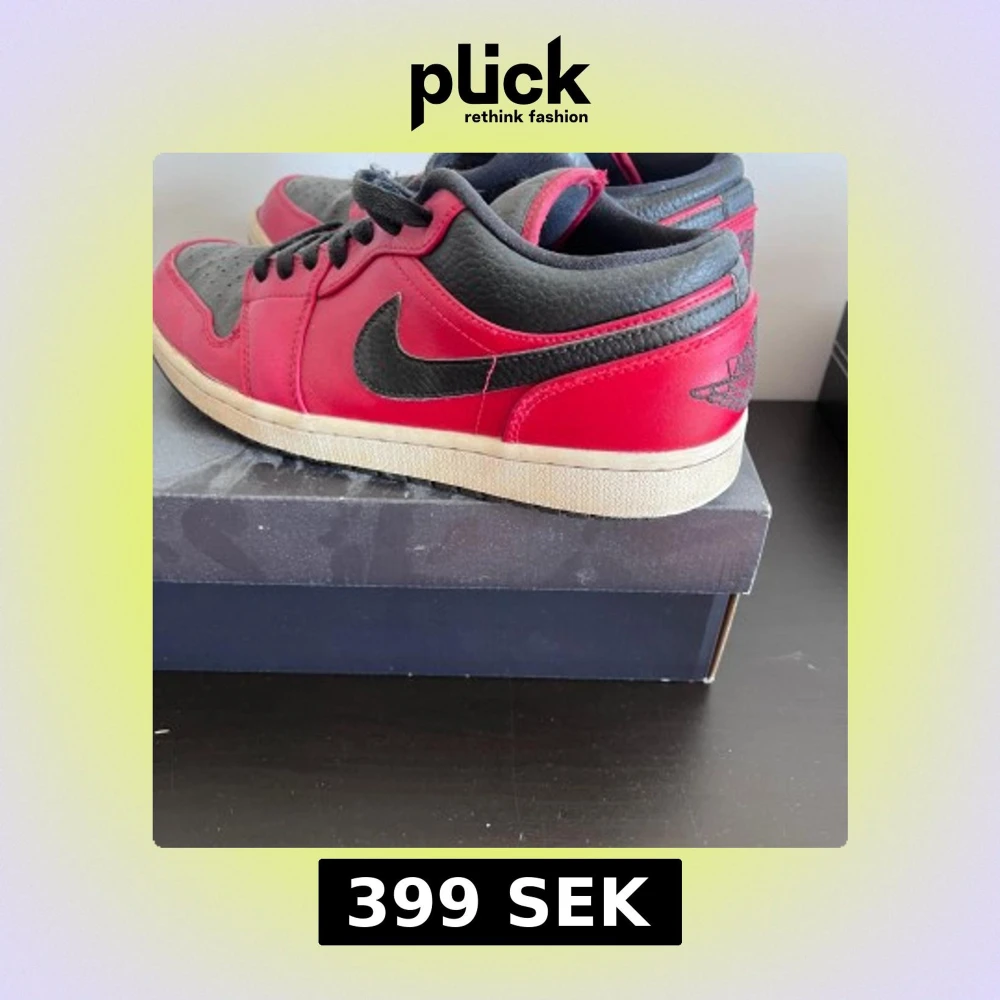 Snygga Nike Air Jordans i en klassisk röd och svart färgkombination. Skorna har en låg profil med svart snörning och en vit sula. Perfekta för dig som vill ha en stilren och sportig look. Skicka väldigt bra, hör av dig vid frågor.