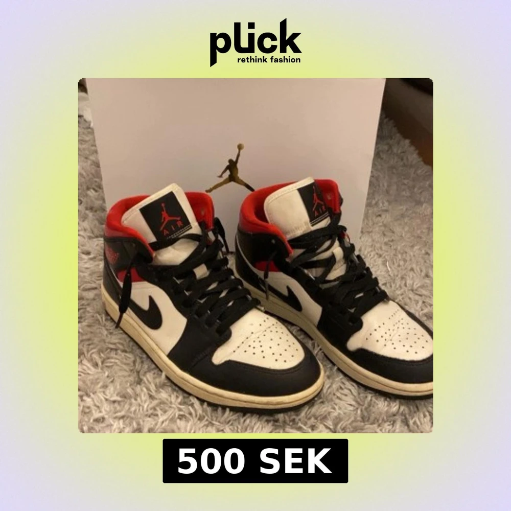 Säljer ett par klassiska Nike Air Jordans i svart, vitt och rött. Skorna har högt skaft, snörning och den ikoniska swoosh-loggan på sidan. Perfekta för dig som gillar streetwear och sneakers med retrostil.