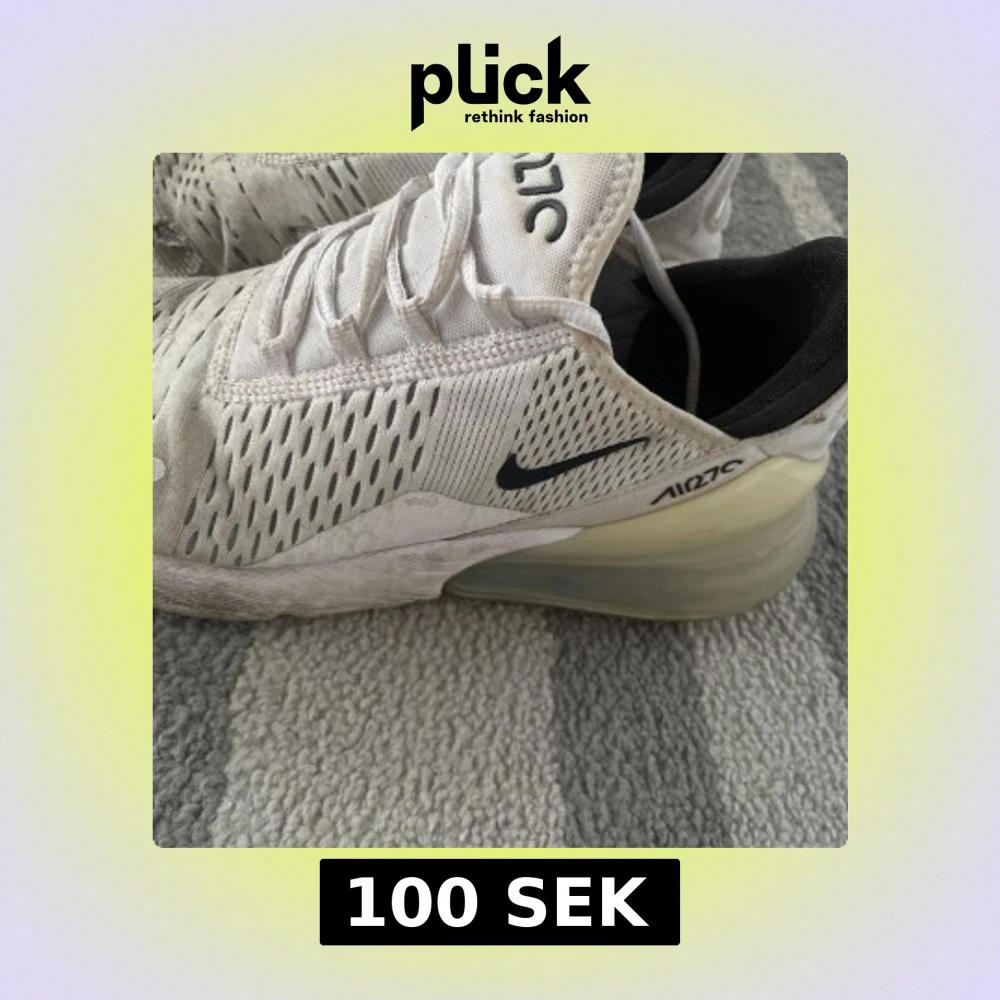 Säljer ett par vita Nike Air Max 270 sneakers med svart Nike-logga och synlig Air-enhet i hälen. Skorna har snörning och en modern design med ventilerande material.