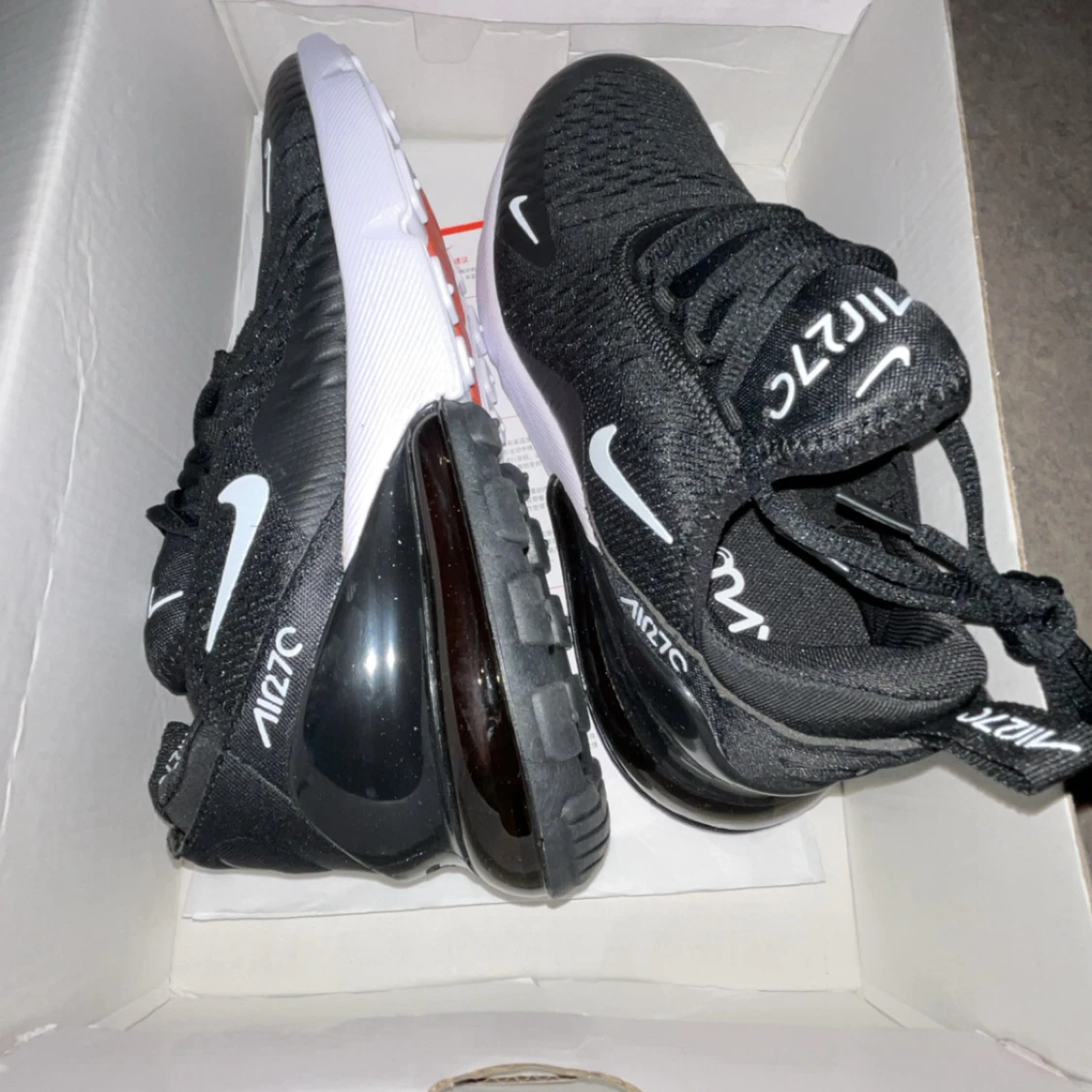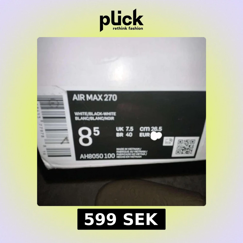 Nike Air Max 270 sneakers i svart och vitt med tydlig Air Max-dämpning i hälen. Ovandel i mesh för bra andningsförmåga, vit sula med orange och svarta detaljer undertill. Snygg och sportig look med klassisk Nike-logga på sidan.