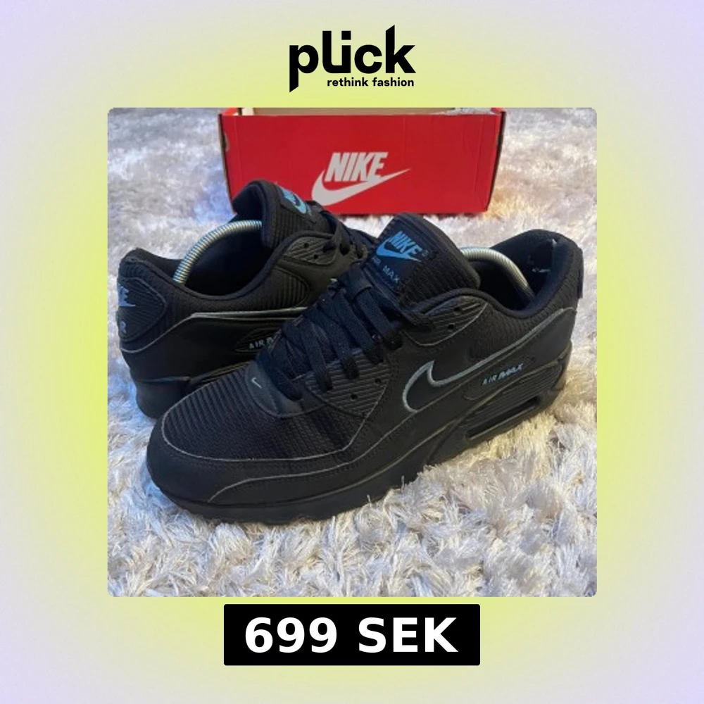 Snygga Nike Air Max 90 sneakers i helsvart med diskreta grå detaljer och klassisk siluett. Ovandel i mesh och syntet, ikonisk Air Max-dämpning i sulan och tydlig Nike-logga på sidan. Perfekta för dig som gillar stilrena och sportiga skor. Lite slitna vid hälarna men märks inte vid användning. Storlek 45