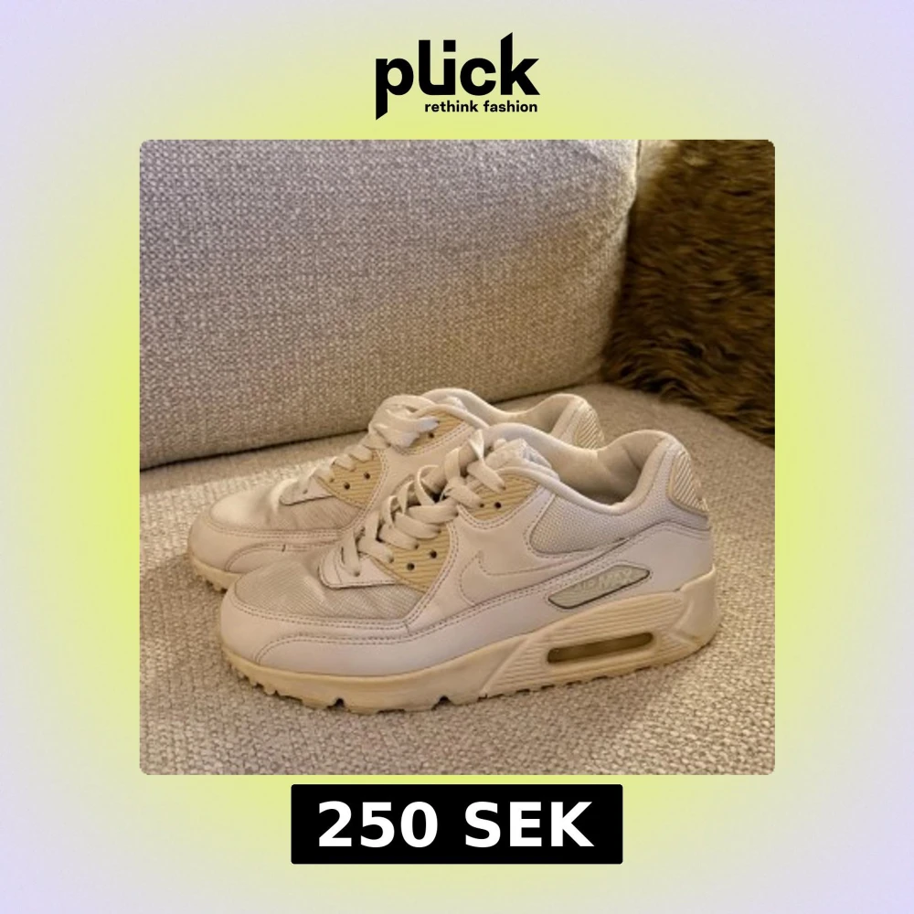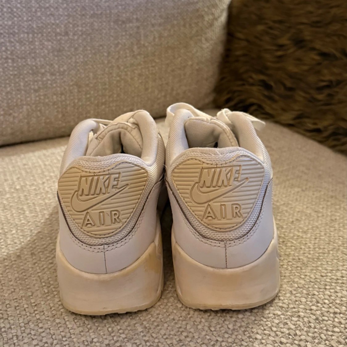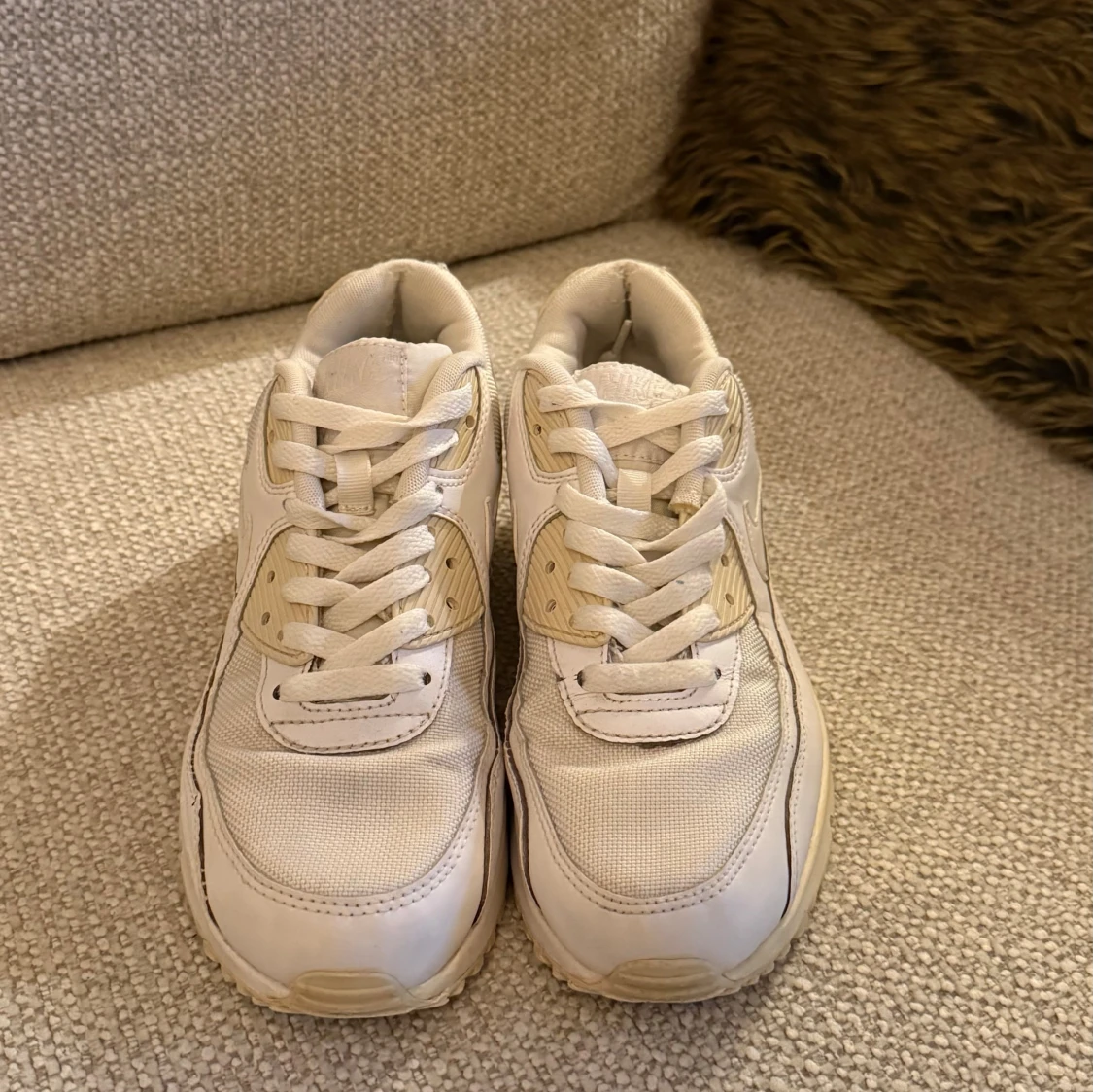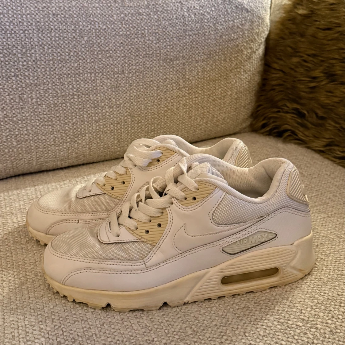 Säljer ett par klassiska Nike Air Max 90 sneakers i helvitt med beige detaljer. Skorna har en chunky sula med synlig Air-enhet, mesh och skinnpaneler samt snörning. Perfekt för dig som gillar retrostil och vill ha bekväma sneakers med snygg design.