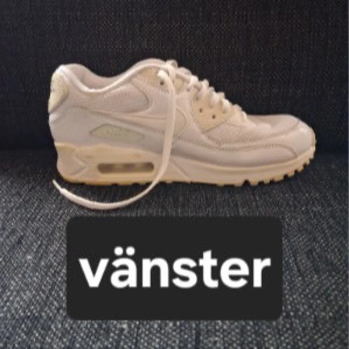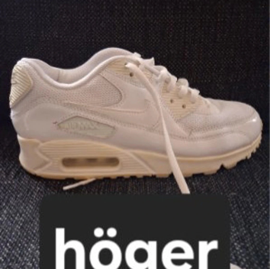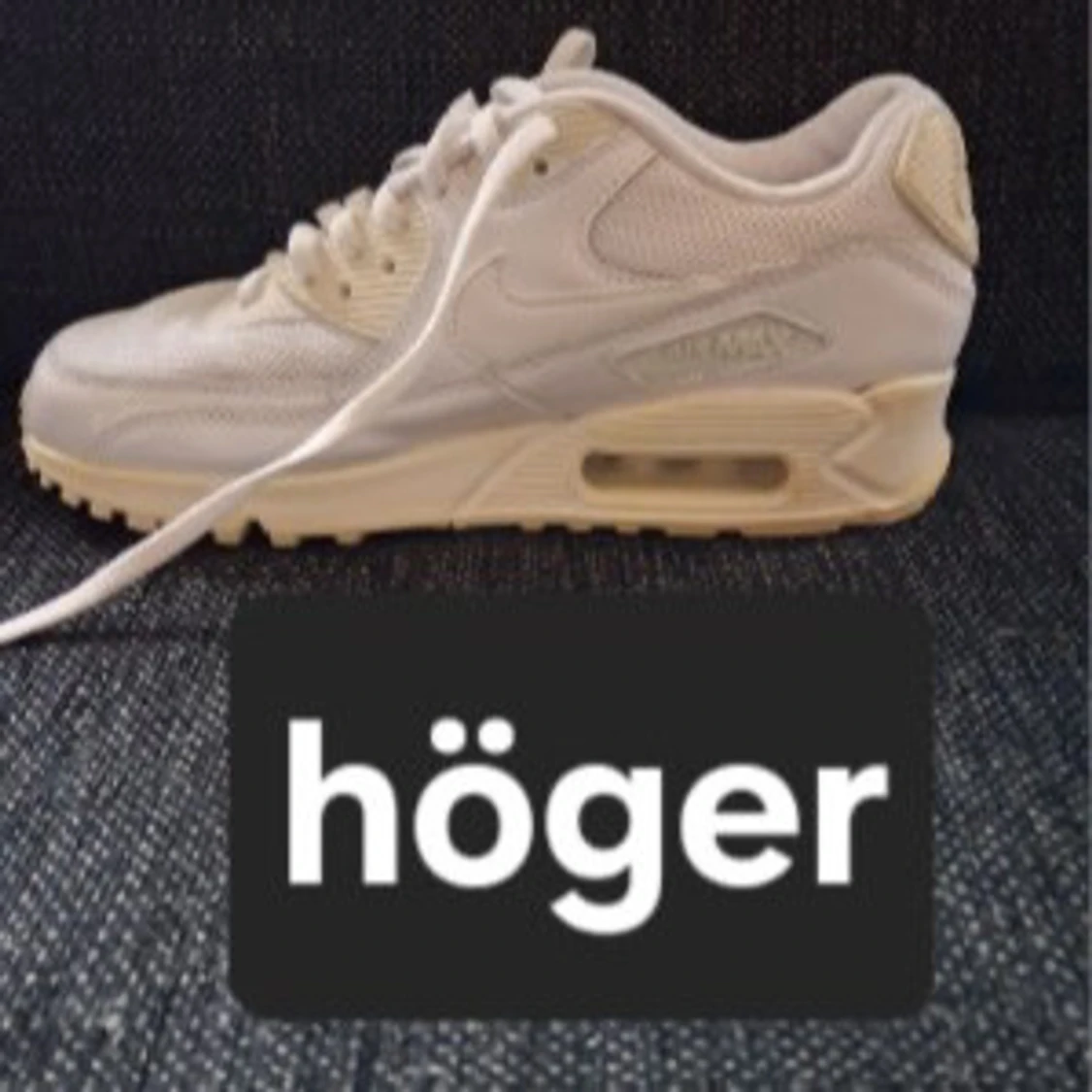 Säljer ett par klassiska Nike Air Max 90 sneakers i helvitt med mesh och skinnpaneler. Skorna har den ikoniska synliga Air-sulan, rund tå och snörning. Perfekta för dig som gillar en clean och sportig look. Röd innersula med Nike-logga.