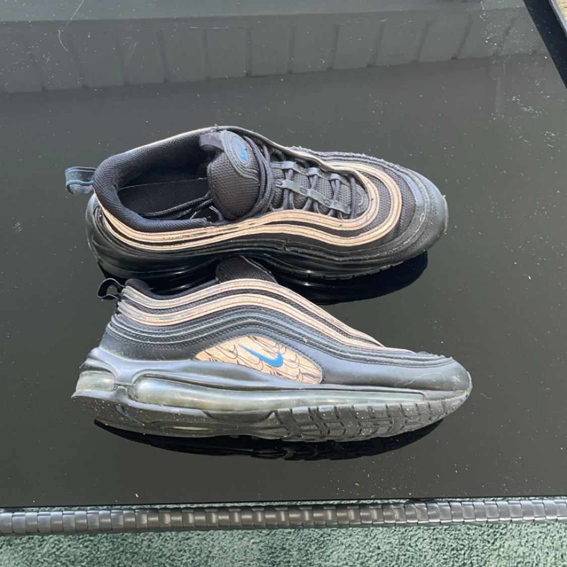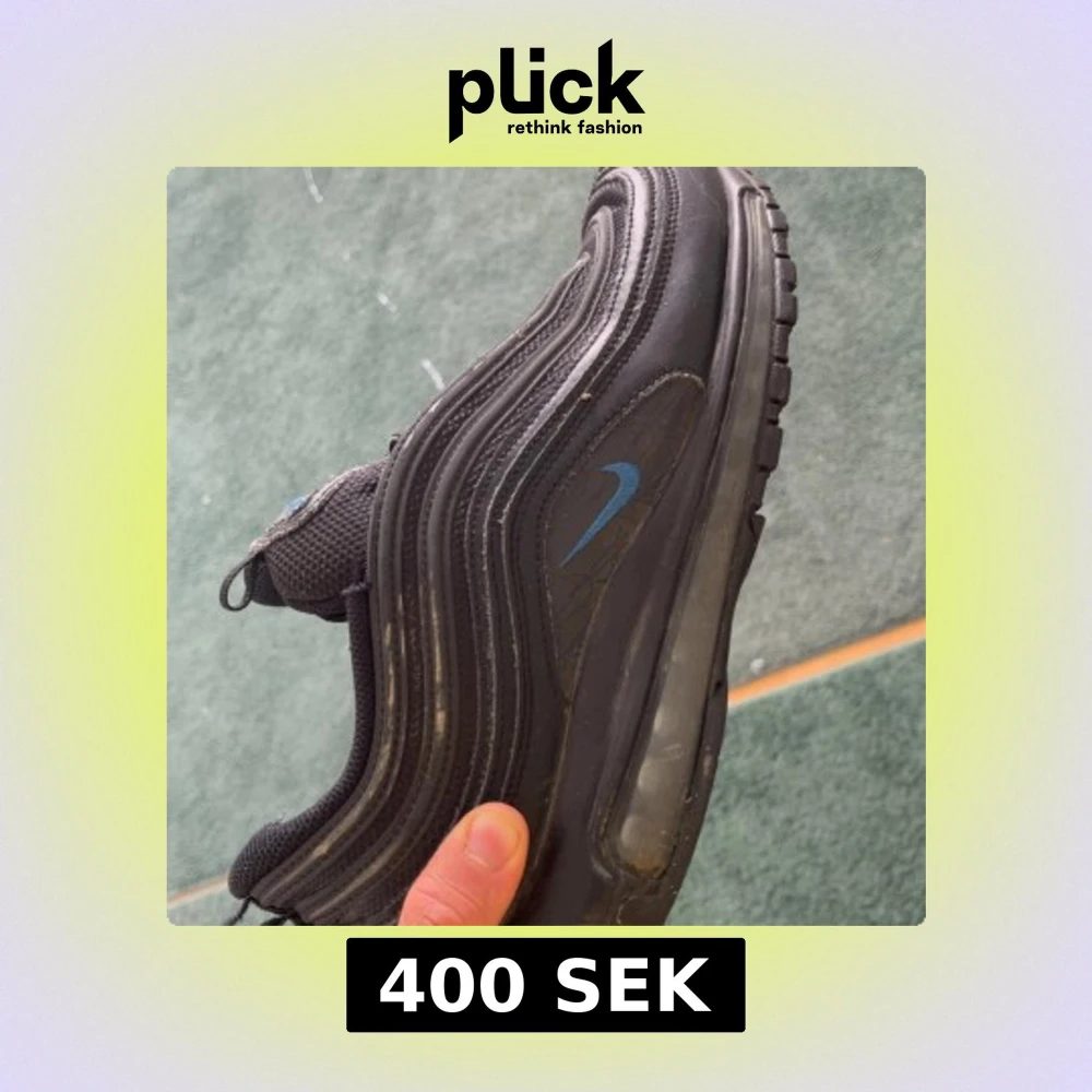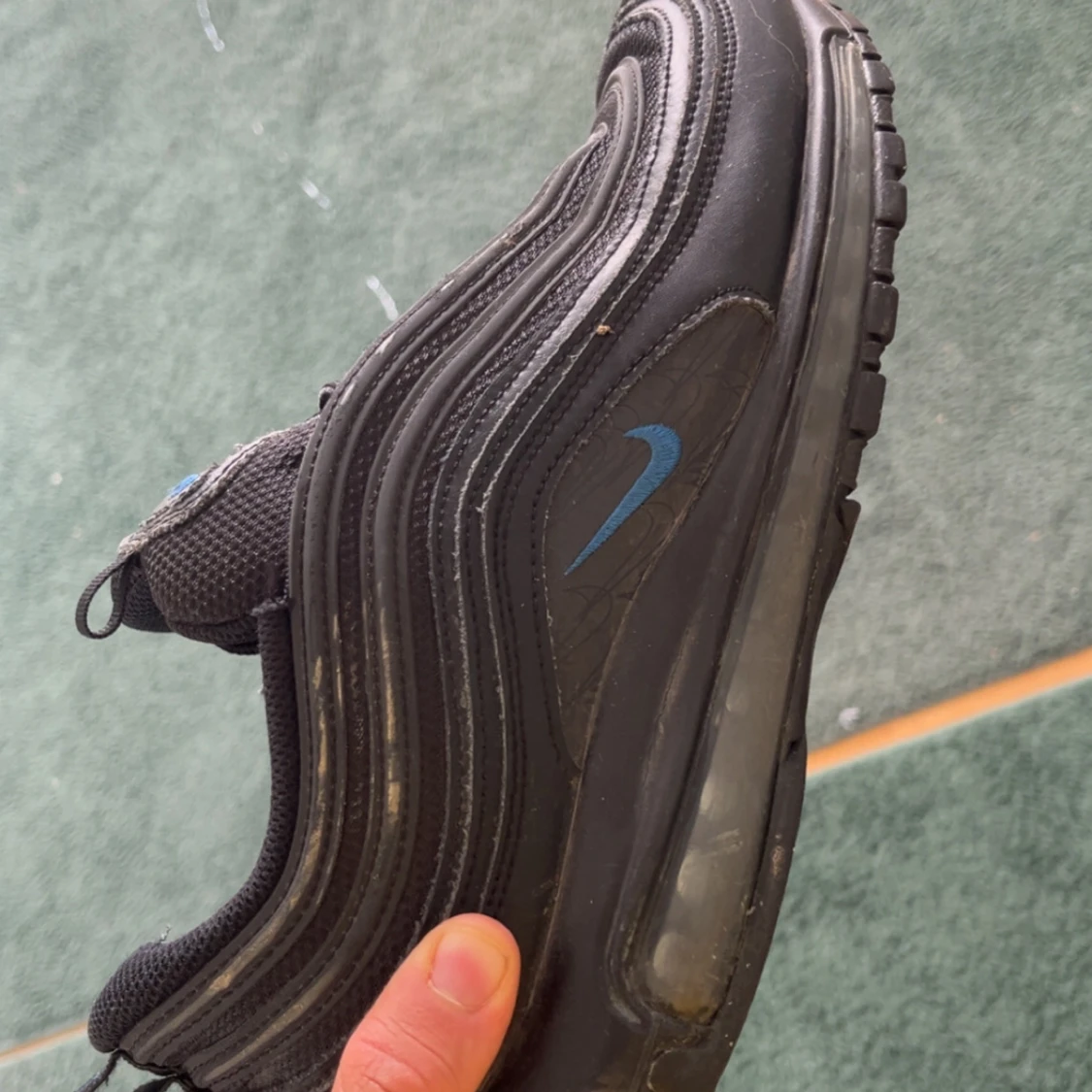 Säljer ett par Nike Air Max 97 sneakers i svart med blå swoosh. Skorna har vågformade detaljer, synlig luftbubbla i sulan och snörning framtill. Ovandelen är i syntet och mesh för en sportig look. Perfekta för dig som gillar streetwear och klassisk Nike-stil. I andra bilden så ser man att dem är lite rivna innanför skorna, men det är inget man känner av när man har på sig skorna.