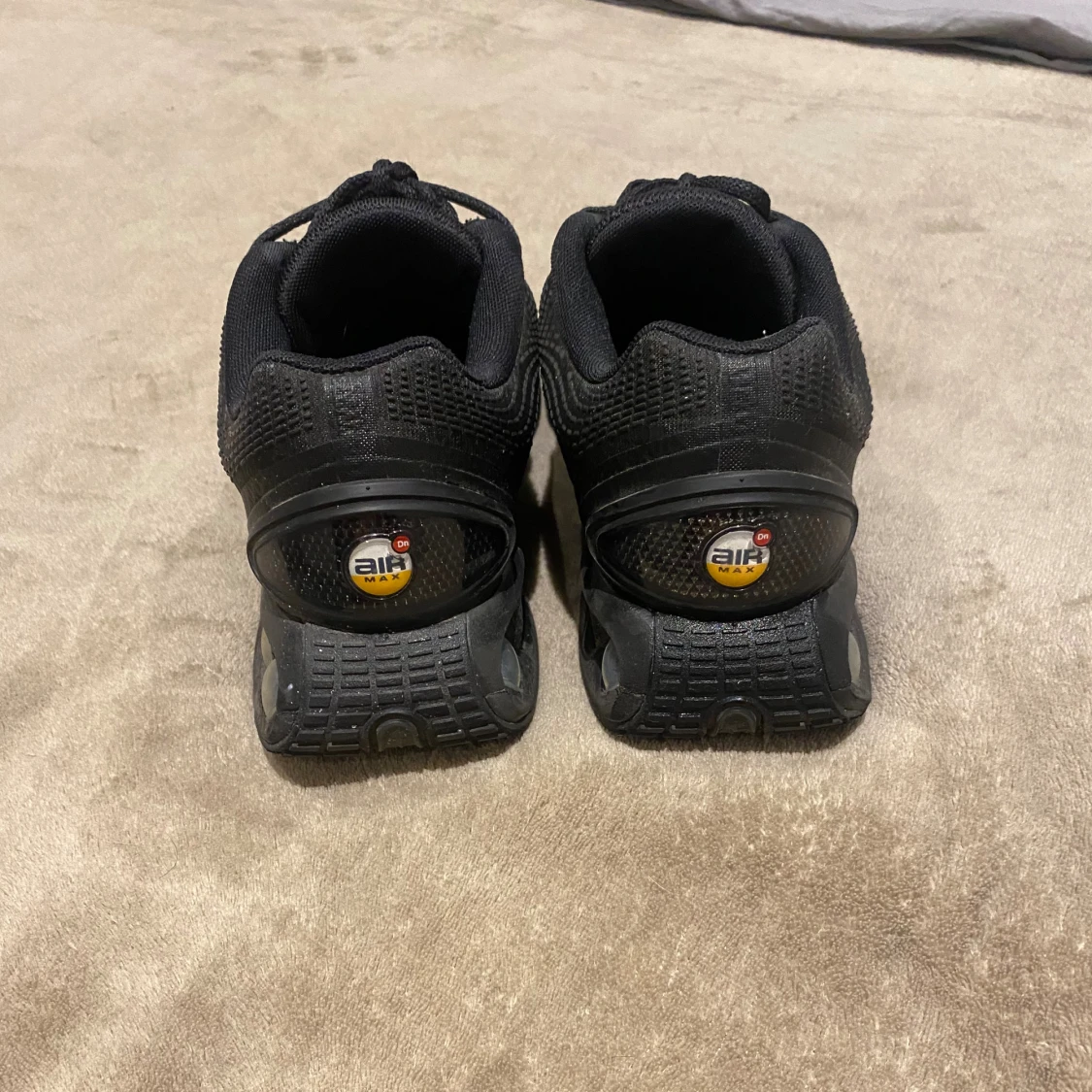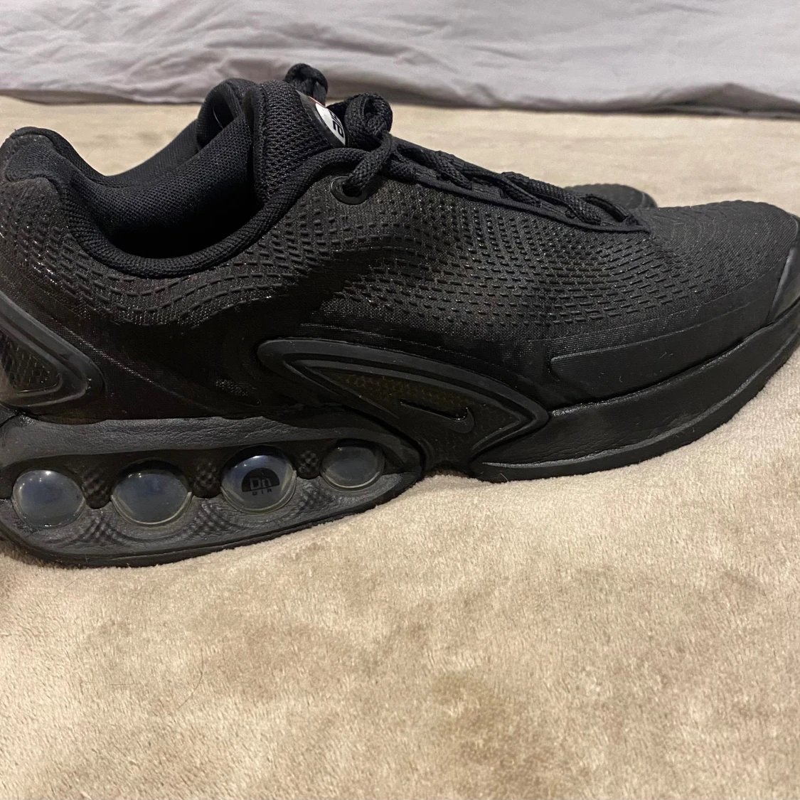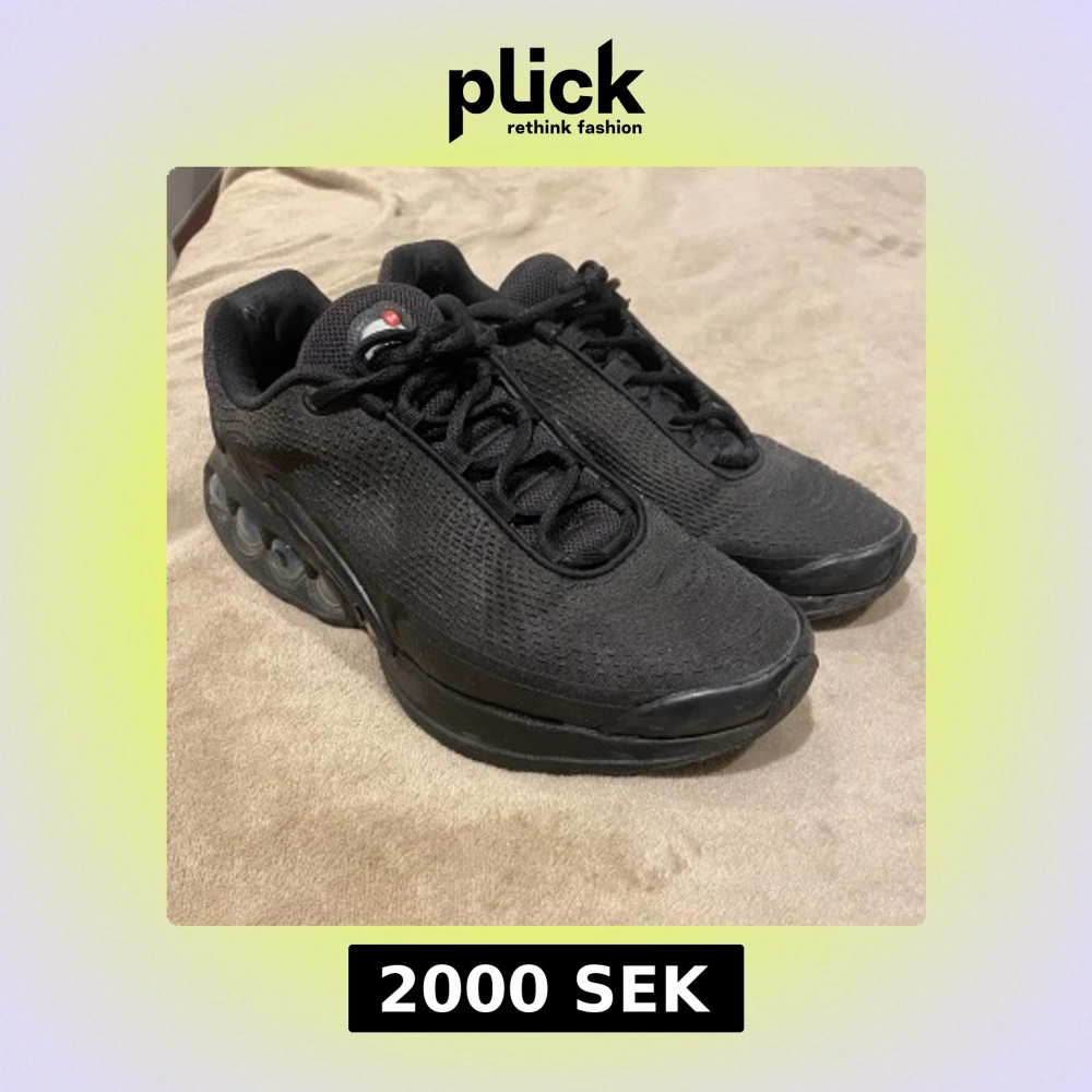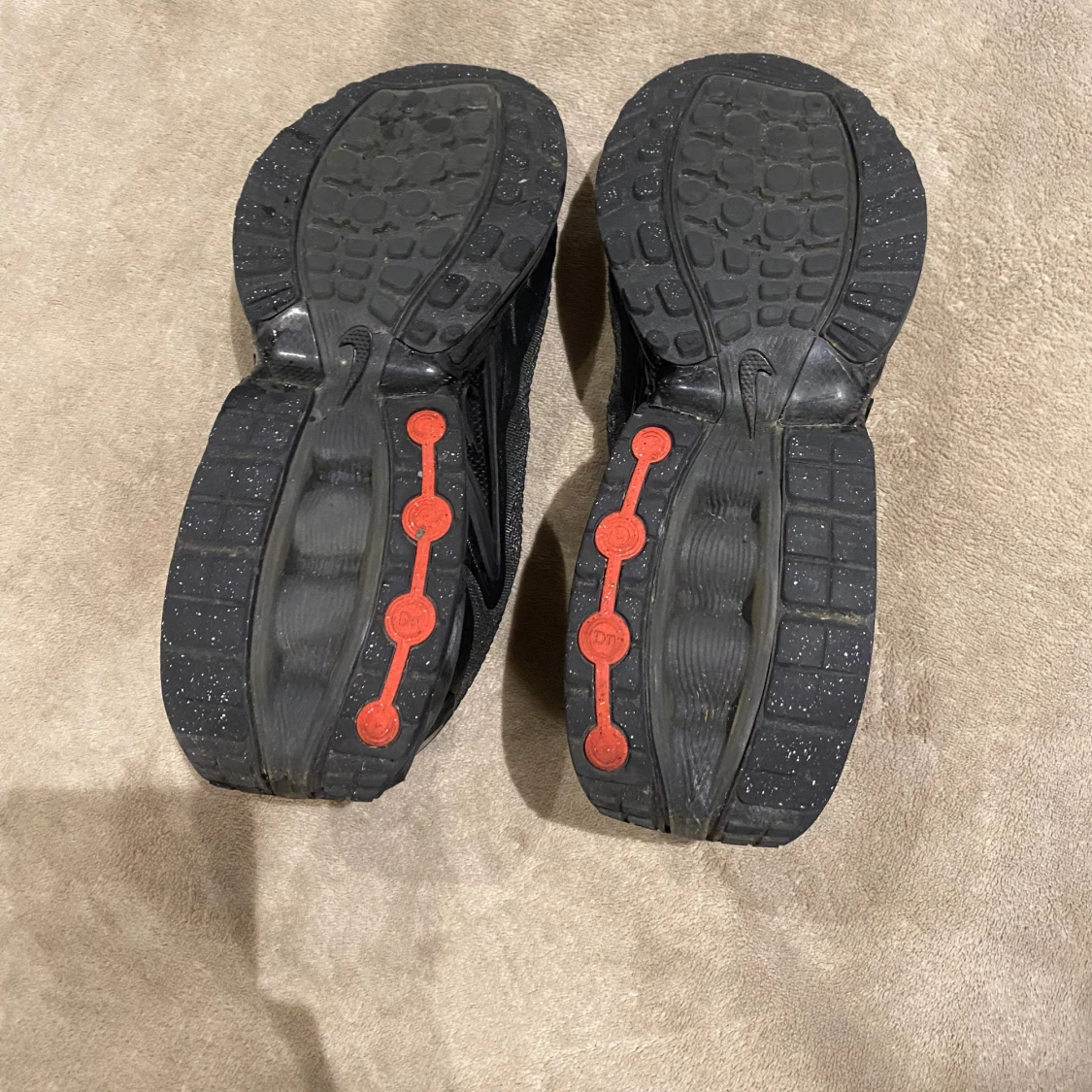 Svarta Nike Air Max sneakers med mesh-överdel och synliga luftbubblor i sulan. Skorna har snörning, rund tå och en chunky sula med röda detaljer undertill. Perfekta för dig som gillar sportig och modern stil.