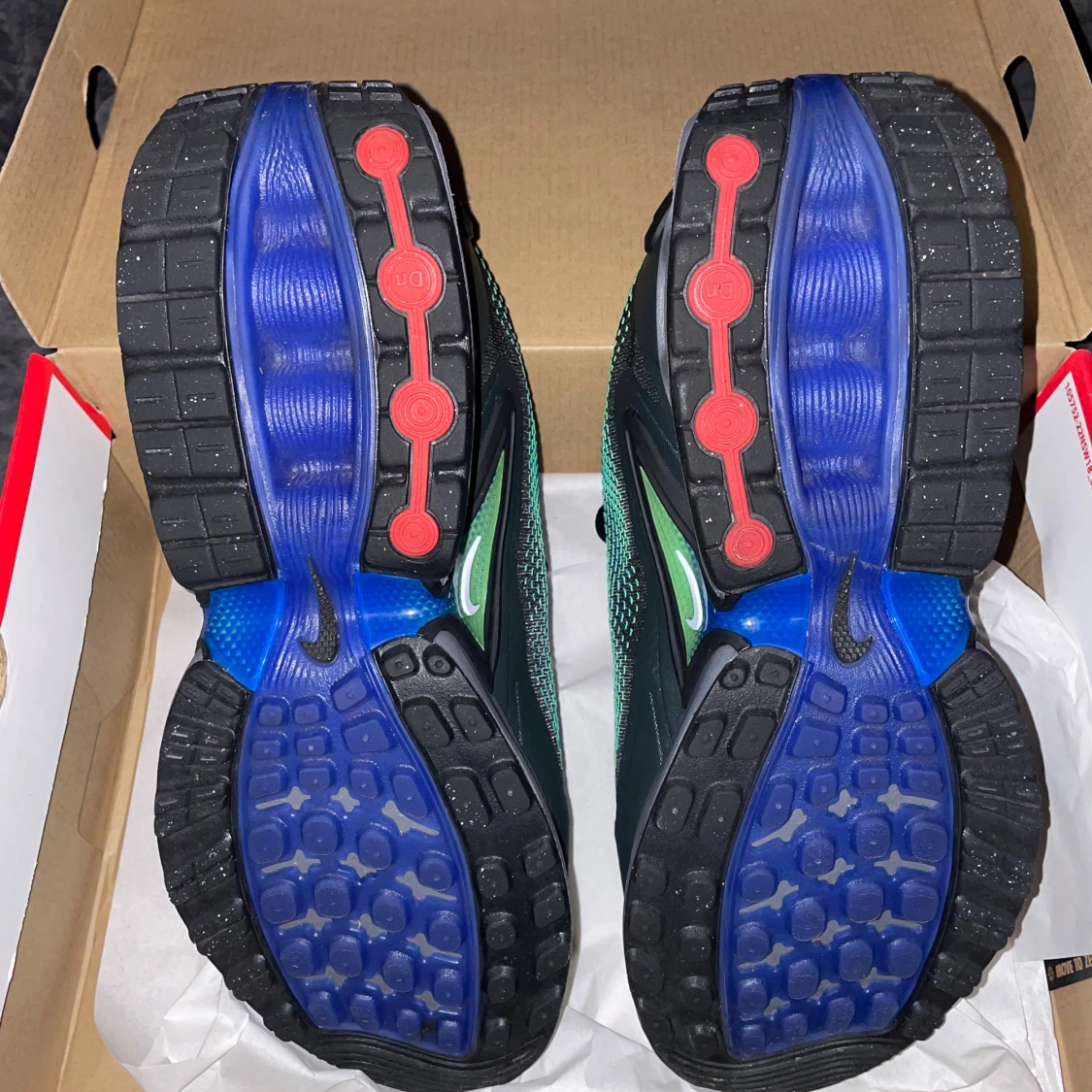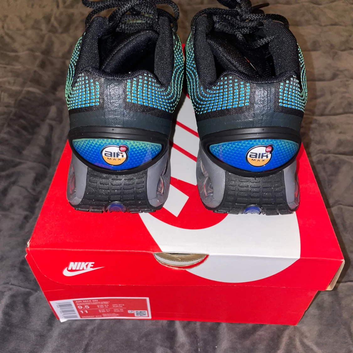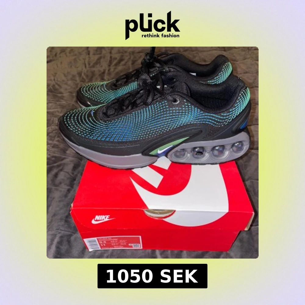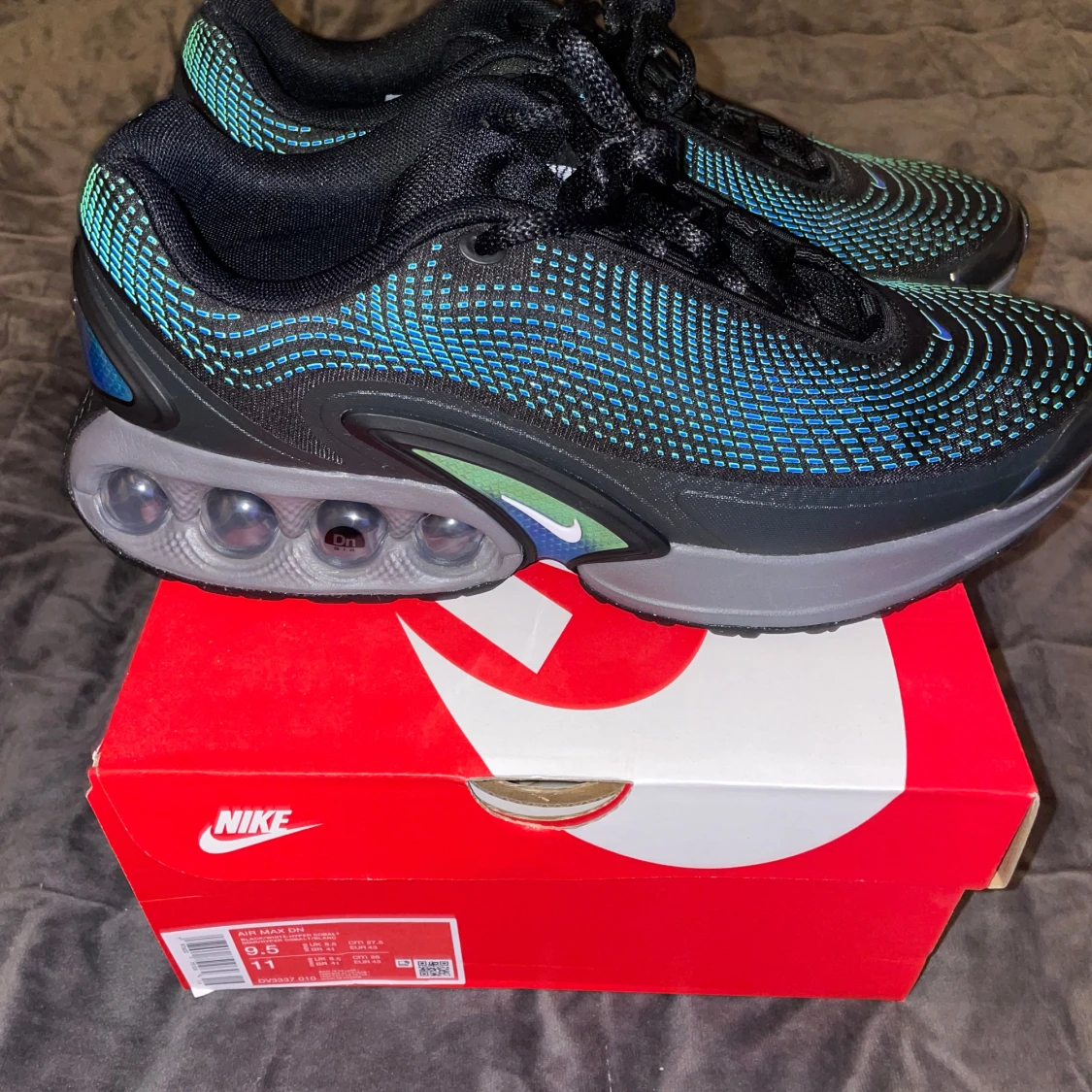 Nike Air Max DN sneakers i svart med blå och gröna detaljer. Ovandelen har ett futuristiskt mönster med små blå rutor och reflekterande inslag. Sulan är grå med synliga Air Max-bubblor och små Swoosh-loggor på sidorna. Skickas med shoeboxen.