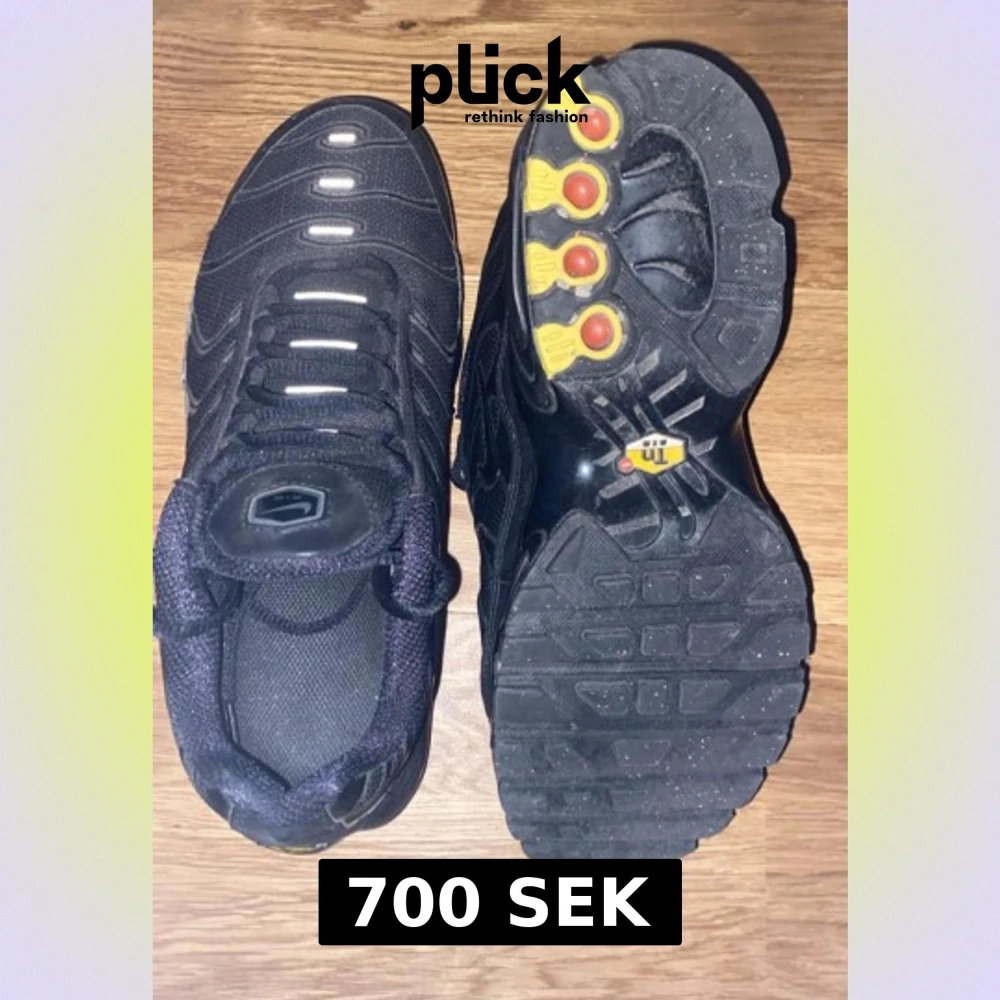 Nike Air Max Plus sneakers i svart med mesh och syntetpaneler, ikoniska vågiga linjer och synlig Air Max-dämpning i sulan. Snygga detaljer med gula och röda inslag under sulan, snörning och rund tå. Perfekt för dig som gillar sportig och modern stil.