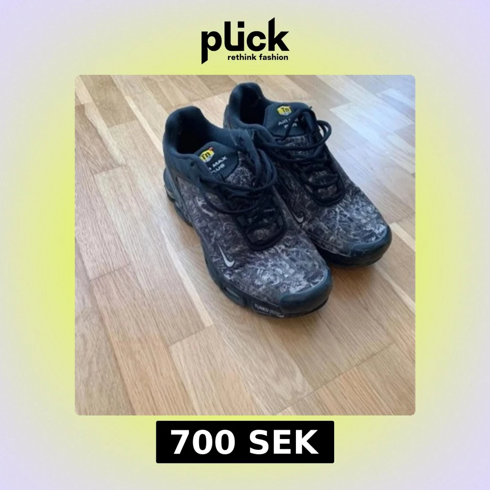 Nike Air Max Plus sneakers med svart och grått mönstrat tyg, svarta detaljer och snörning. Snygg streetstil med robust sula och Tuned Air-dämpning. Ikonisk TN-logga på plösen och hälen. Perfekt för dig som gillar unika sneakers med attityd.