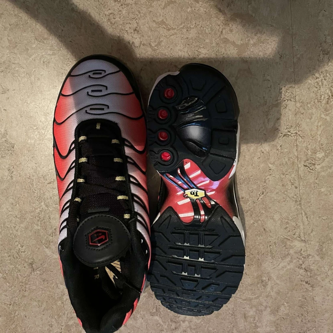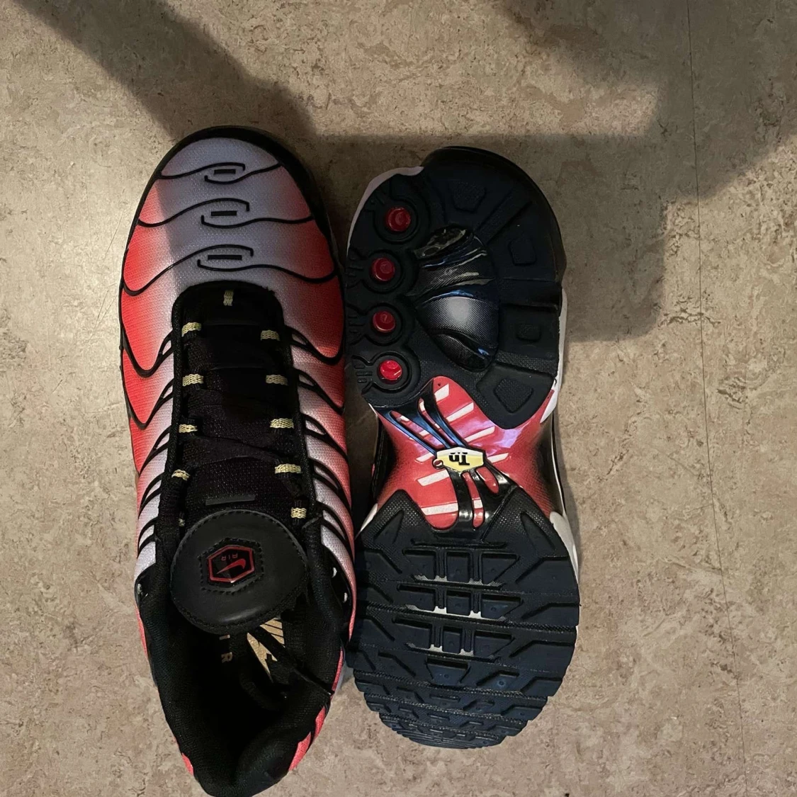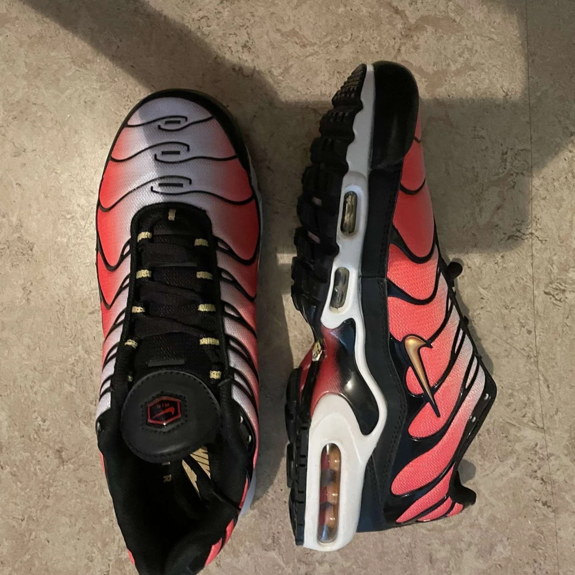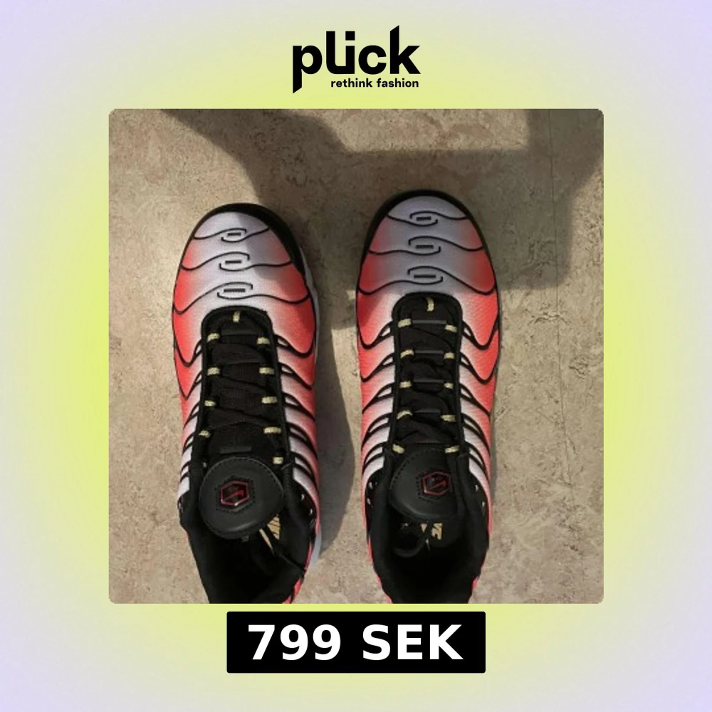 Nike Air Max Plus TN sneakers med en grym färgskiftning från rött till vitt och svarta detaljer. Snygga vågformade linjer, svart snörning och synlig Air Max-dämpning i sulan. Guldiga TN-detaljer på häl och sula. Perfekta för dig som vill sticka ut.