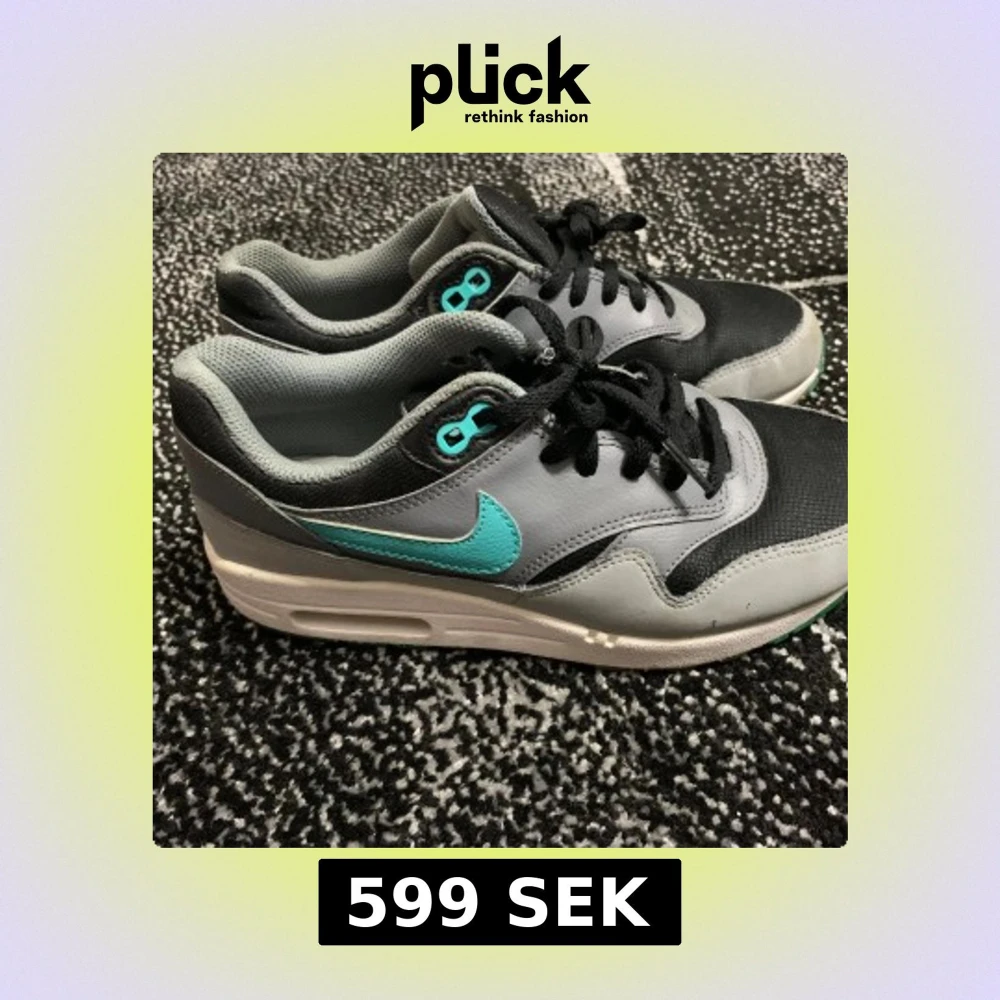 Nike Air Max sneakers i grått och svart med turkos swoosh och detaljer. Ovandel i syntet och mesh, svart snörning och vit sula med synlig Air-enhet. Skorna har rund tå och klassisk Air Max-design som ger en sportig vibe.