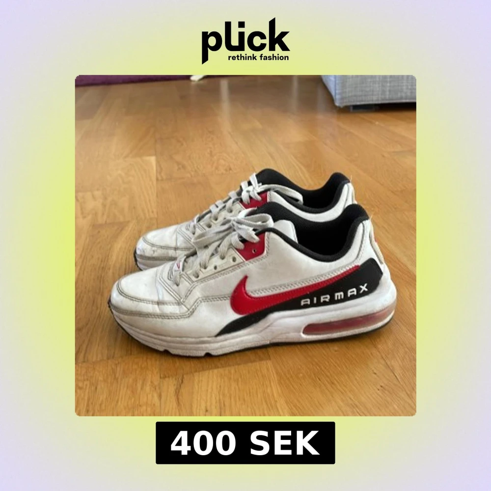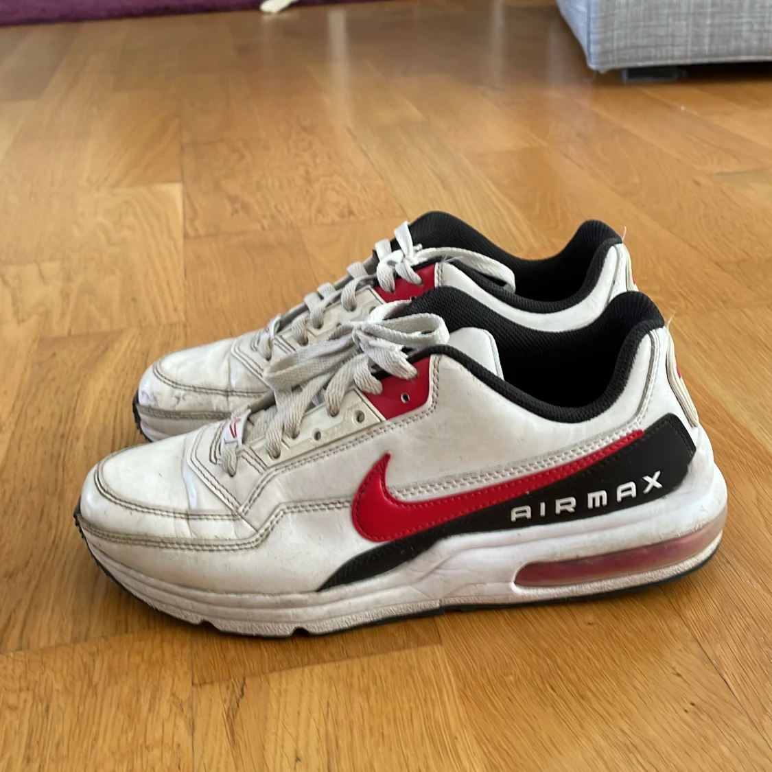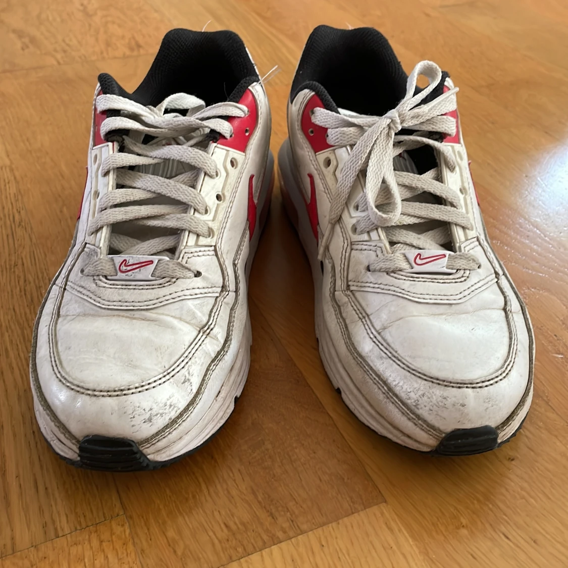 Nike Air Max sneakers i vitt med röda och svarta detaljer. Klassisk Air Max-dämpning i sulan och tydlig Nike-logga på sidan. Skorna har snörning och svart innermaterial. Perfekta för dig som gillar sportig och retro stil.
