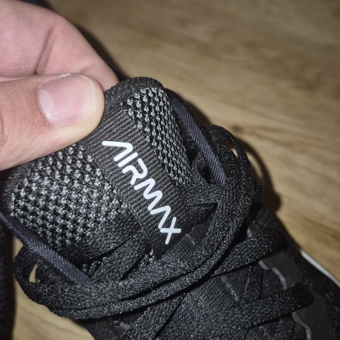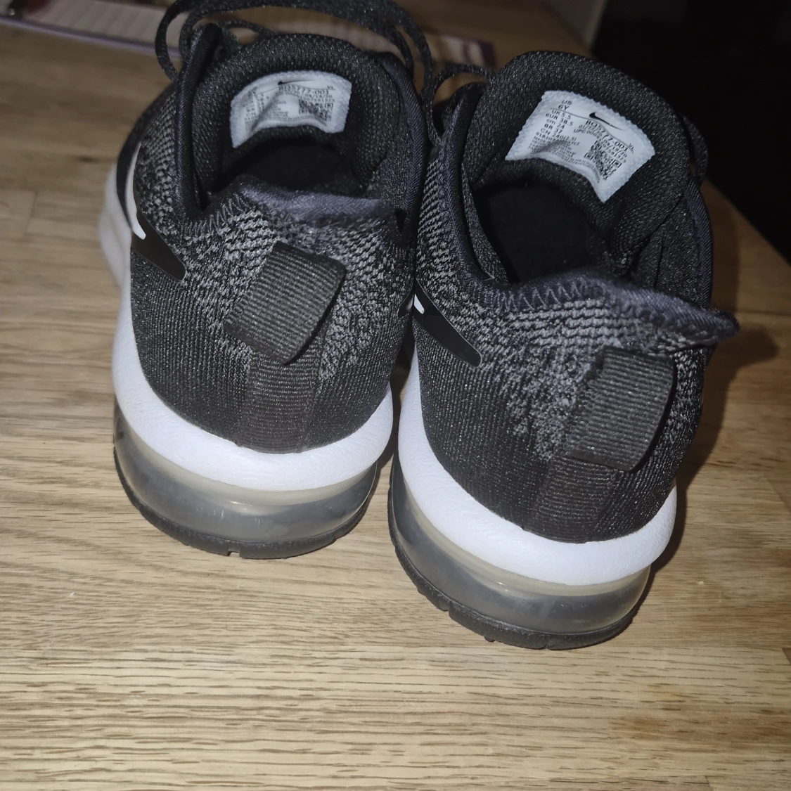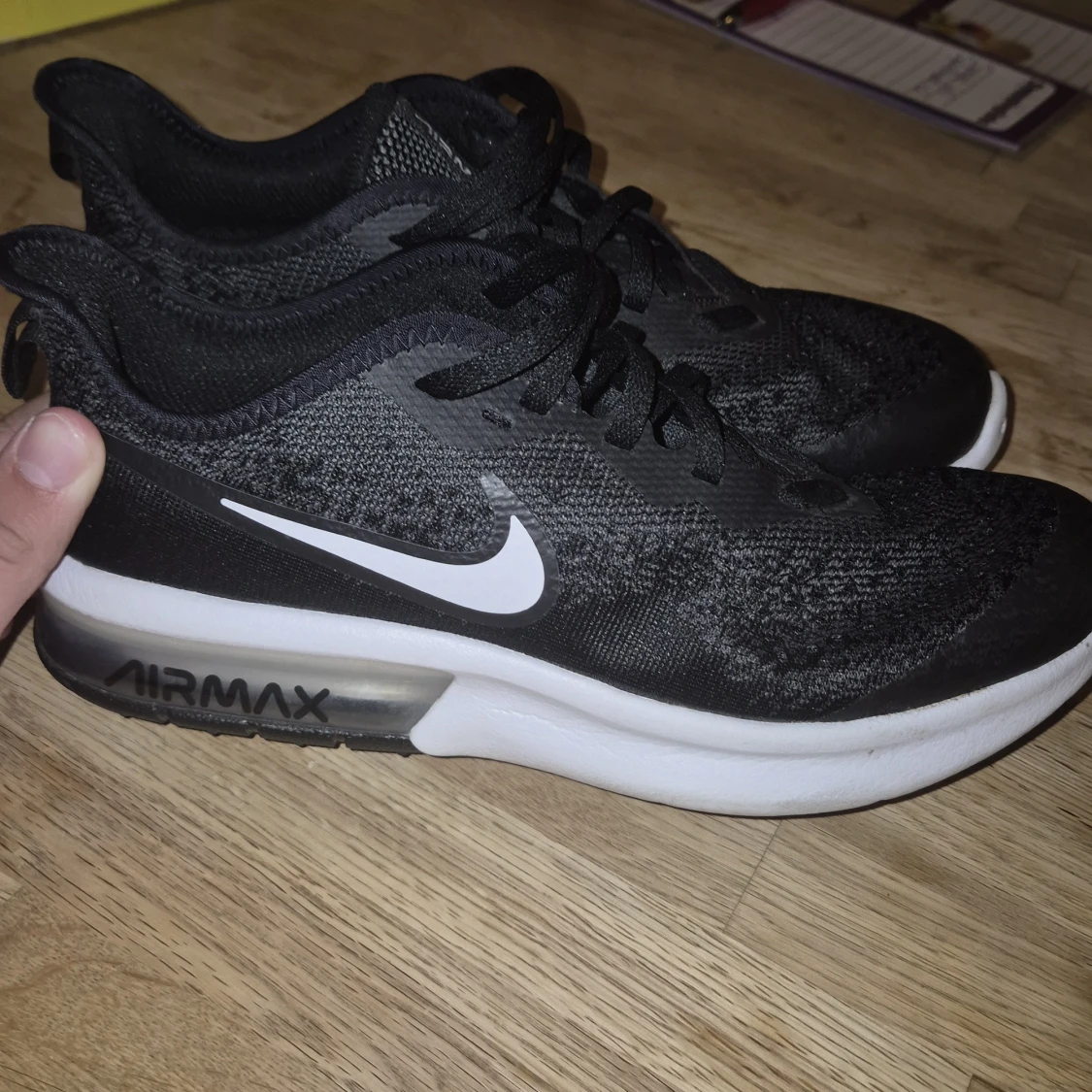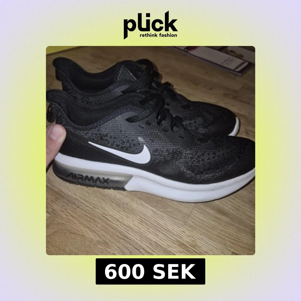 Svarta Nike Air Max sneakers med vit sula och tydlig Air Max-dämpning. Använda 2 gånger. Ovandelen är i mesh och syntet, med vita detaljer och snörning. Klassisk sportig look med rund tå och platt sula, perfekt för dig som gillar streetstyle och komfort.