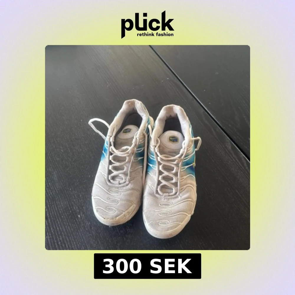 Nike Air Max Plus sneakers i vitt och blått med coola vågiga detaljer och gula TN-loggor. Skorna har snörning, platt sula och synliga Air Max-enheter i sulan. Materialet är syntet och mesh för skön ventilation. Perfekt för dig som gillar retrostil och streetwear.