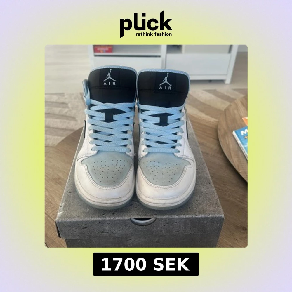 Snygga Nike Air sneakers i vitt med ljusblå detaljer och svarta accenter. Skorna har en klassisk hög modell med snörning och den ikoniska Nike-loggan på sidan. Perfekta för en stilren look.