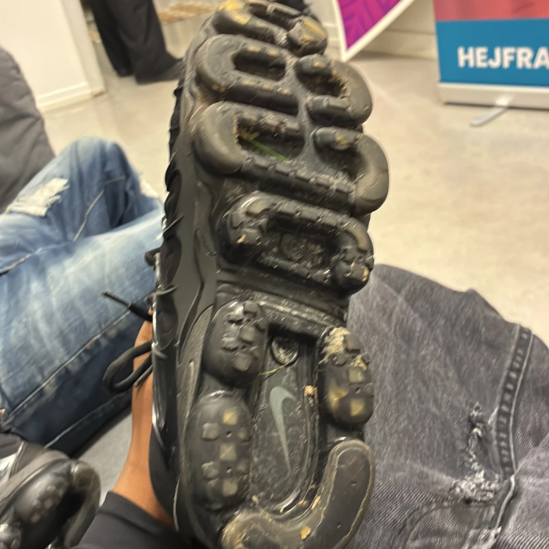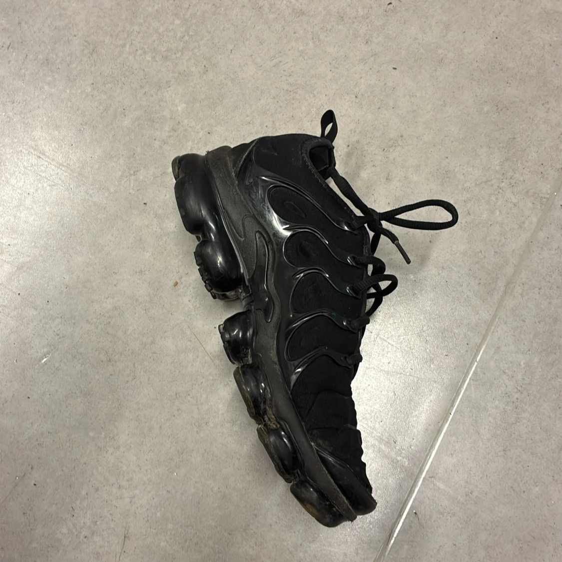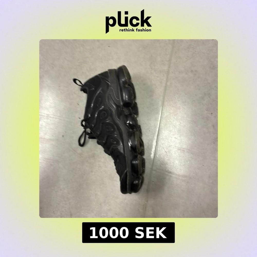 Nike Air Vapormax Plus i helsvart färg med chunky, genomskinlig sula och snygga vågiga detaljer på sidan. Skorna har snörning och en modern, sportig look som sticker ut. Perfekt för dig som gillar streetwear och vill ha något som syns.