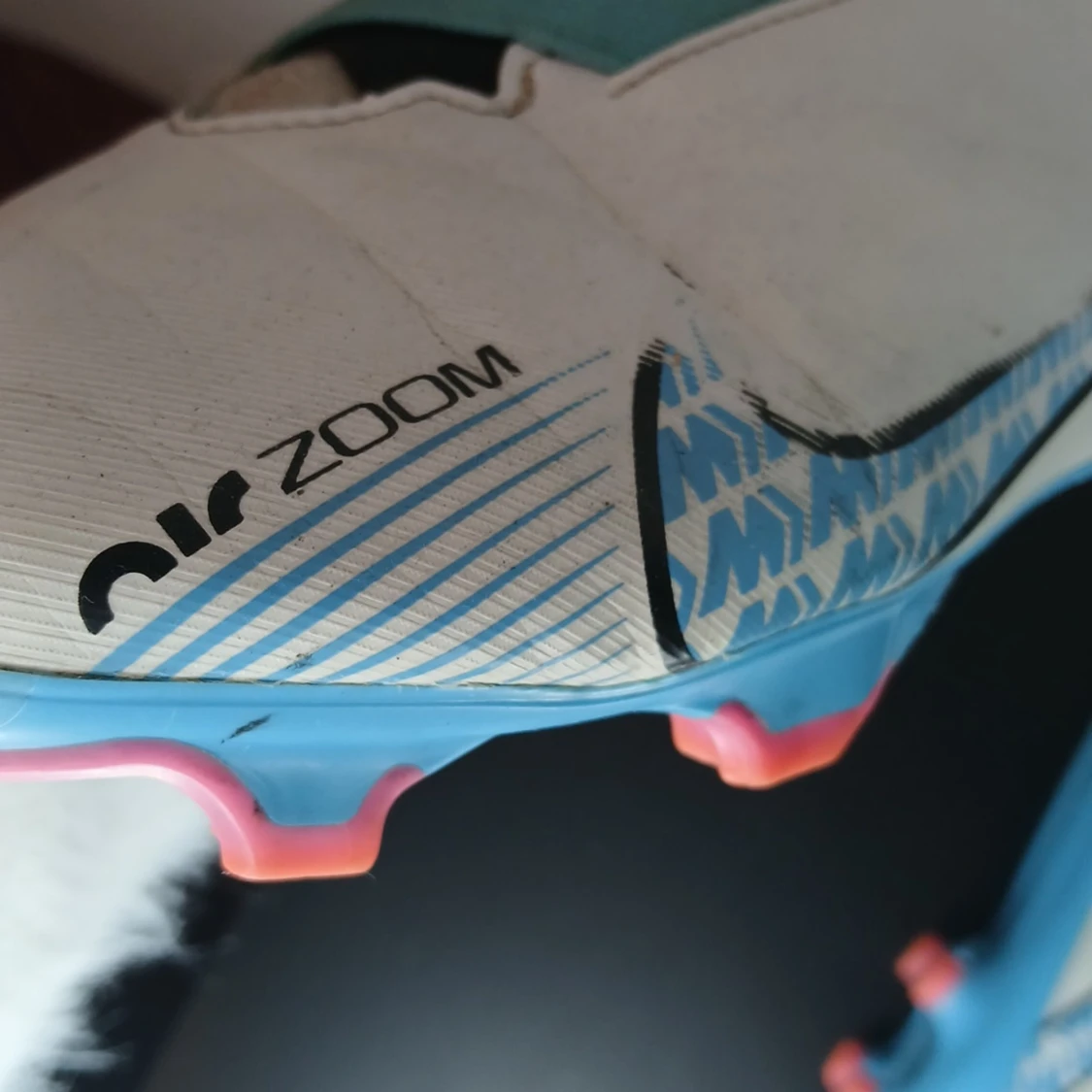 Snygga Nike Air Zoom fotbollsskor i vitt med blå och svarta detaljer. Skorna har en unik design med blå sula och rosa dobbar, samt ett elastiskt band över vristen för extra stöd. Perfekta för fotbollsplanen med sin moderna look och funktionalitet.