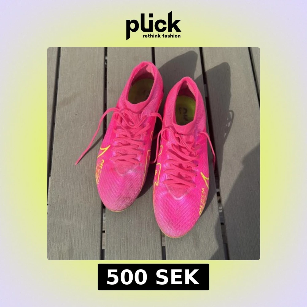 Säljer ett par Nike Air Zoom Mercurial fotbollsskor i en riktigt snygg rosa färg med gula och svarta detaljer. Skorna har snörning och är designade för att ge bra grepp på planen. Perfekta för dig som vill sticka ut på fotbollen!