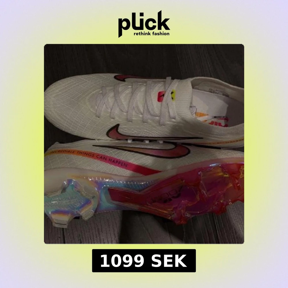 Säljer ett par vita Nike fotbollsskor i syntetmaterial med coola regnbågsdetaljer och inspirerande text på sidan. Skorna har snörning och en färgglad sula som verkligen sticker ut. Perfekta för att göra ett statement på planen!