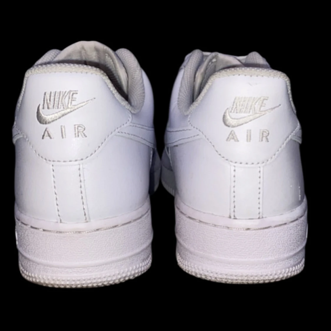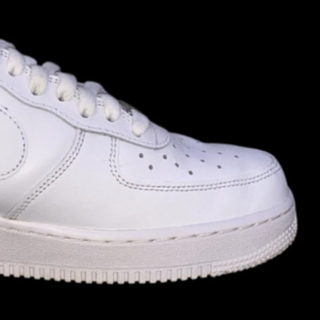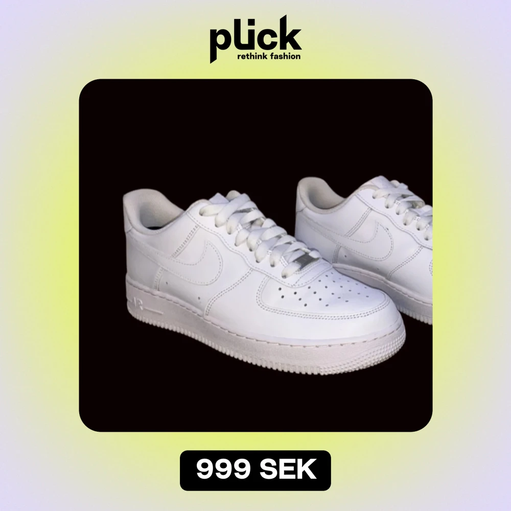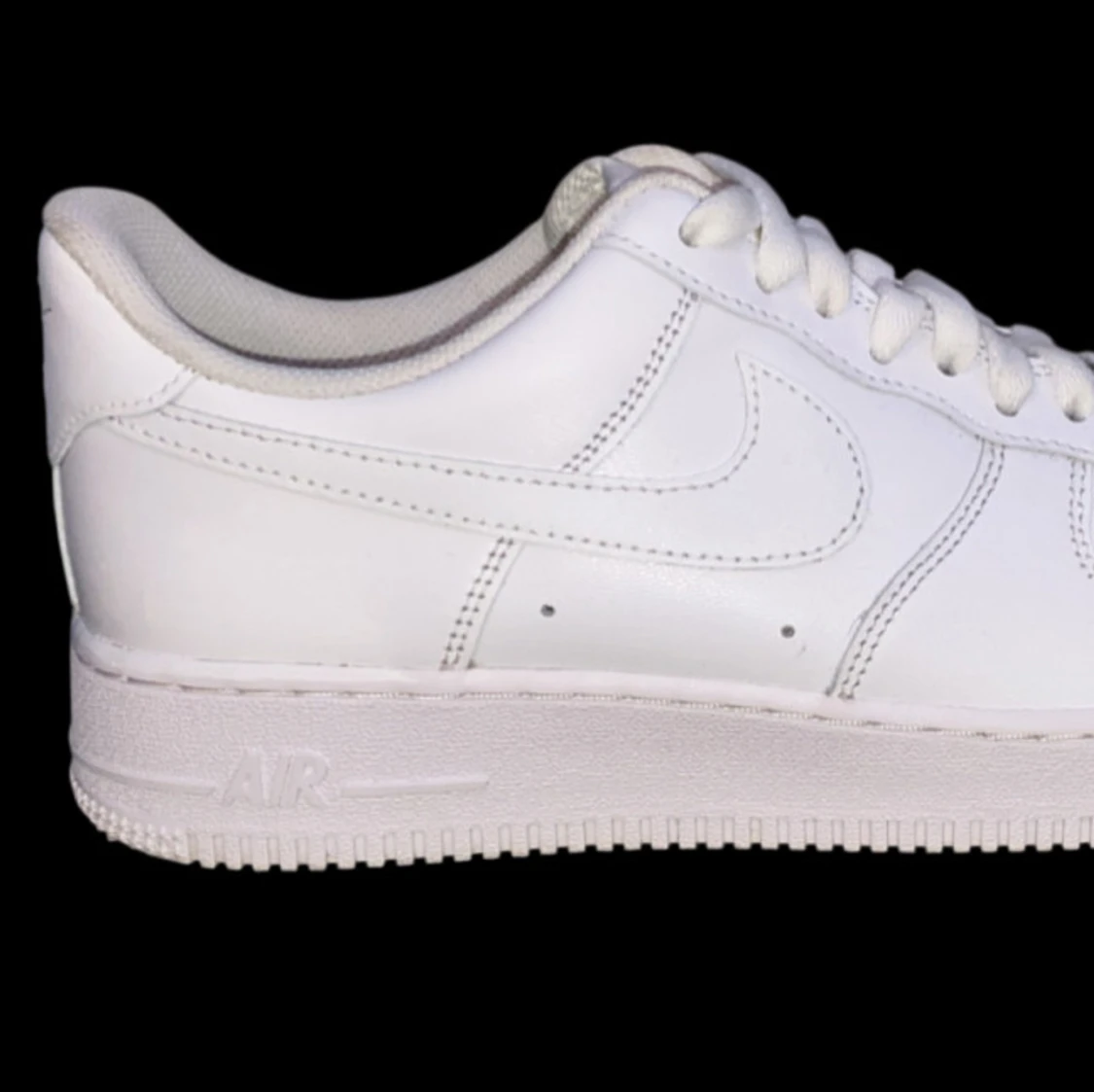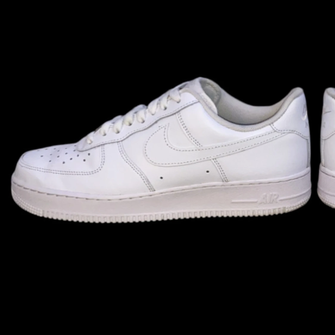 Säljer ett par klassiska vita Nike Air Force sneakers i skinn. De har en stilren design med snörning och perforerade detaljer på tån för extra ventilation. Perfekta för både vardag och fest! 🏀👟| äkta skor | box medföljer ej | vid fler frågor så är det bara att skriva😃👍