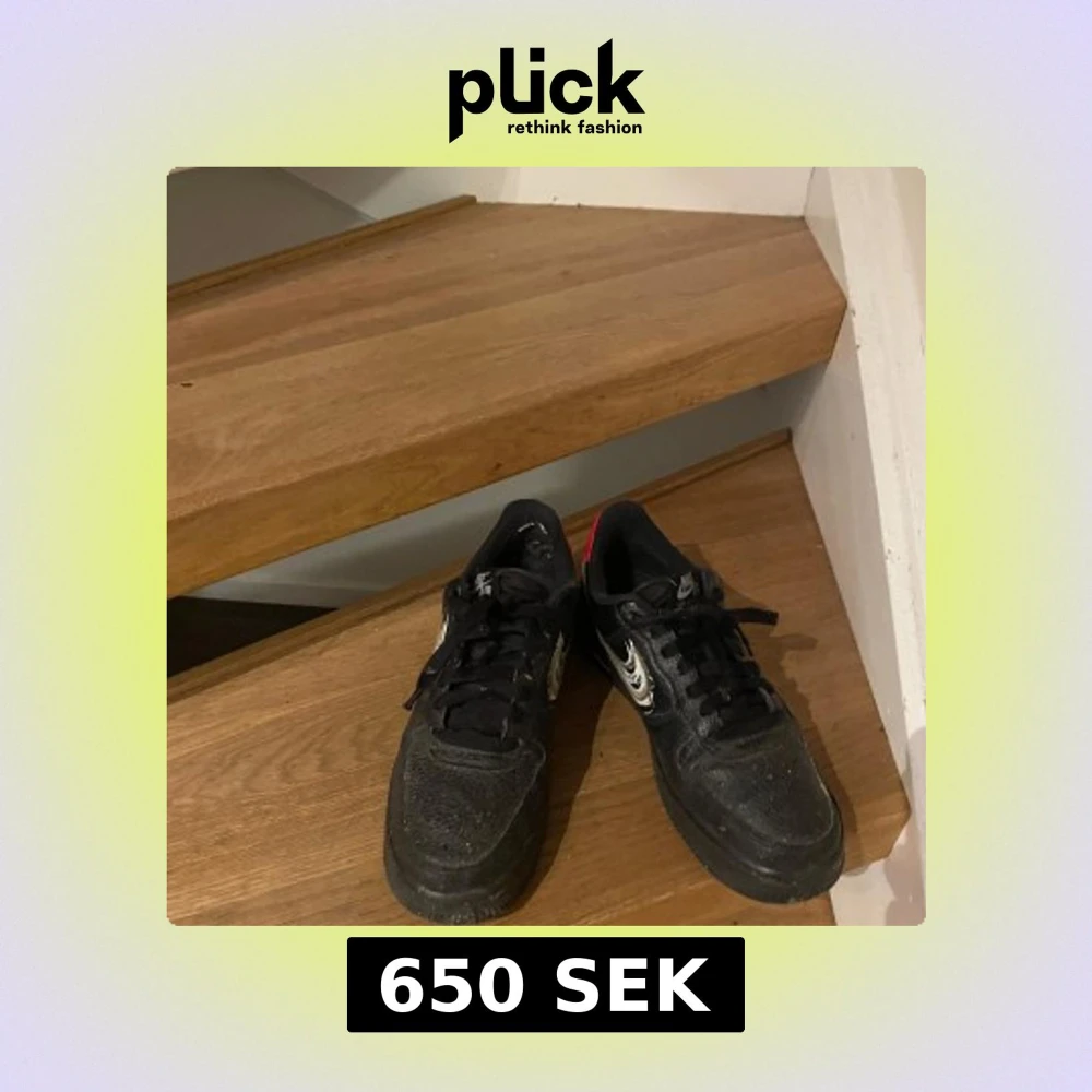 Svarta Nike Air sneakers med vit swoosh och röd detalj på hälen. Skorna har snörning och är tillverkade i syntetmaterial. Perfekta för en sportig look. Lite trasig i hälen.
