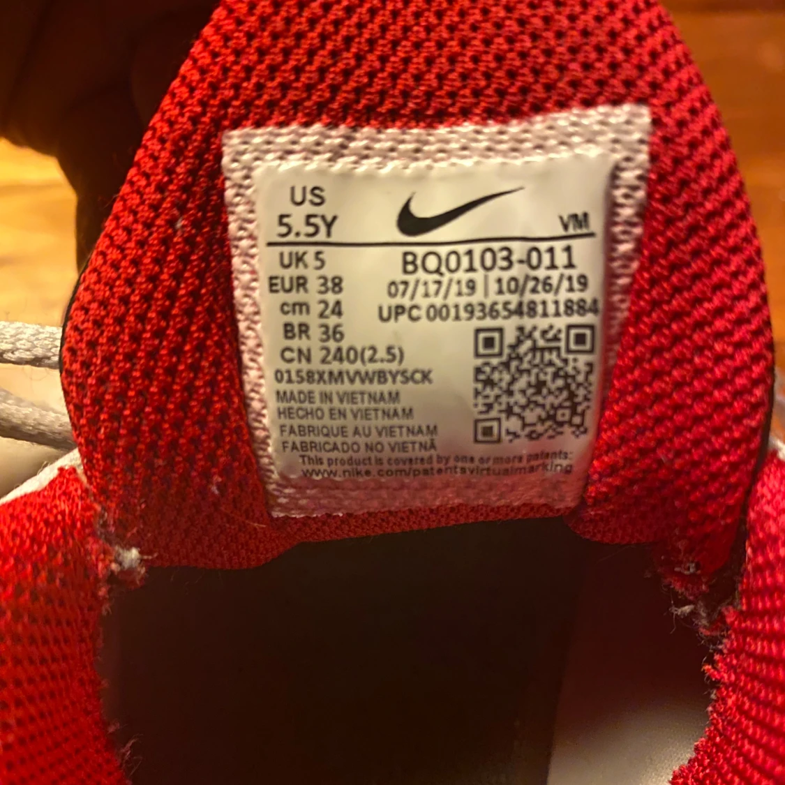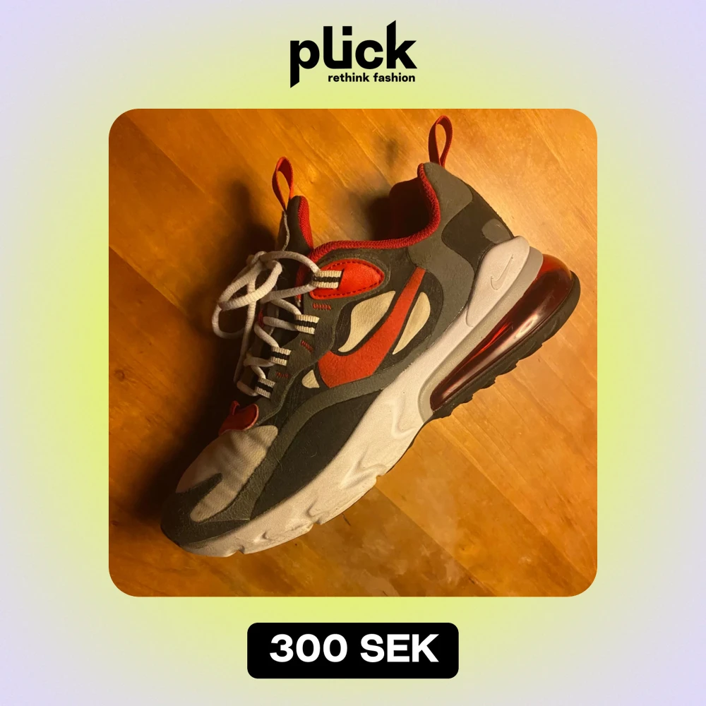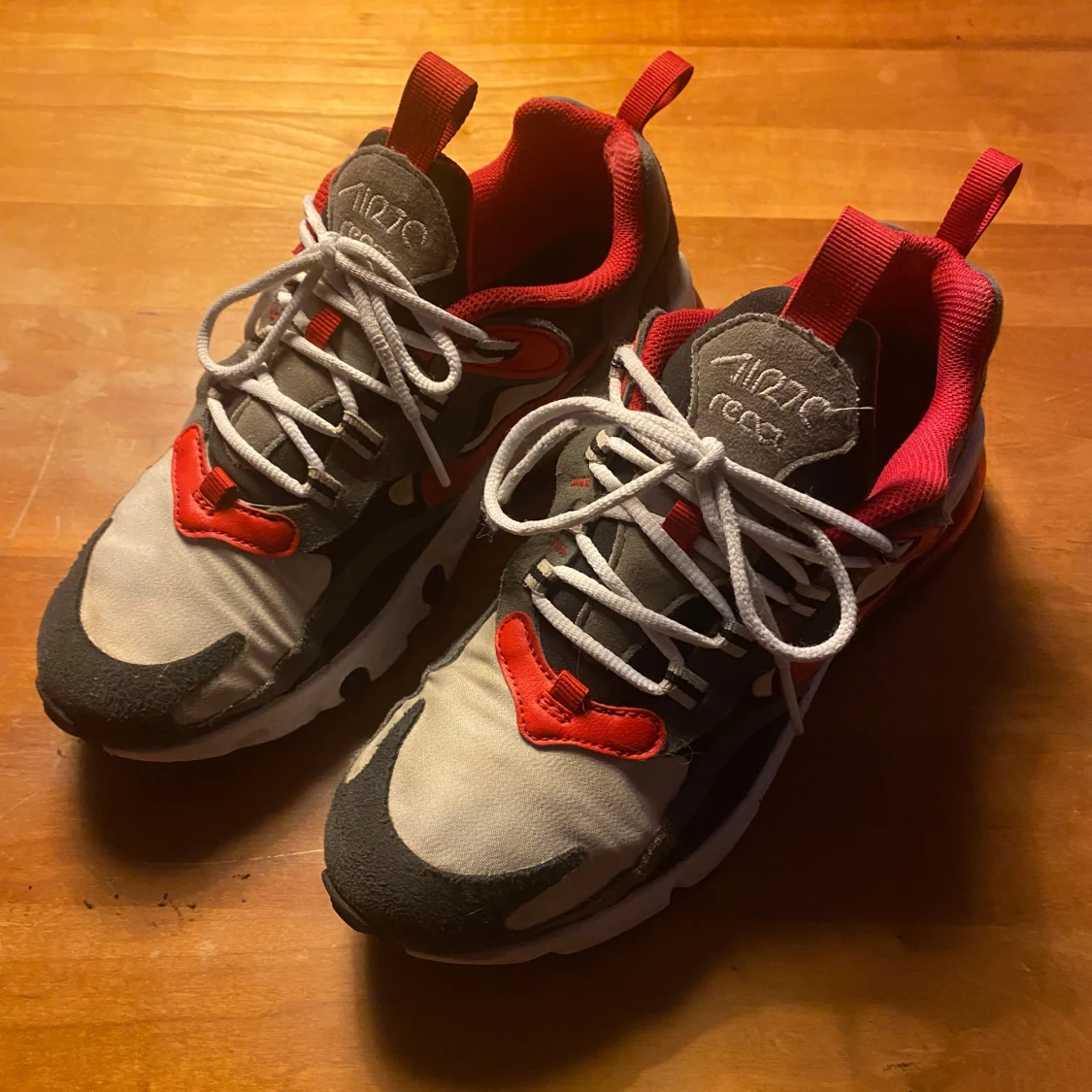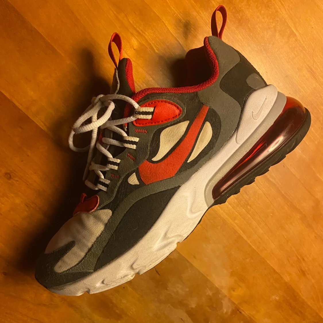 Säljer ett par Nike Air Max sneakers i grått, vitt och rött. De har en nice design med vita snören och en synlig luftkudde i hälen för extra komfort. Perfekta för både vardag och träning.
