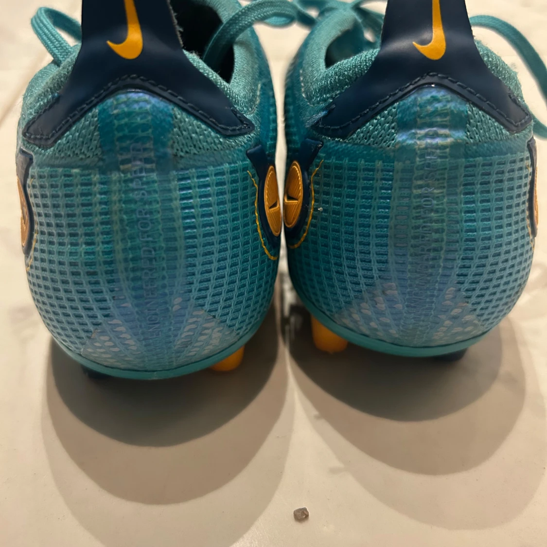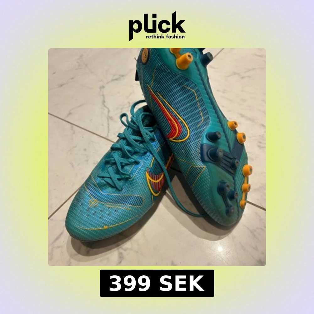 Säljer ett par Nike fotbollsskor i blått med gula och röda detaljer. Skorna har snörning, rund tå och platt sula med fasta dobbar i gult och blått. Ovandelen är i syntetmaterial med ett mönstrat rutnät och Nike-logga på sidan. Perfekta för dig som vill sticka ut på planen.