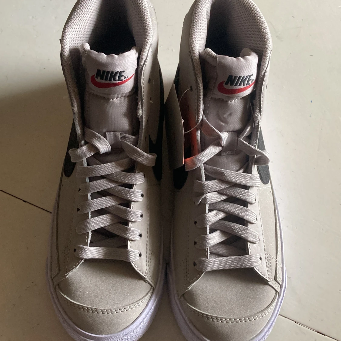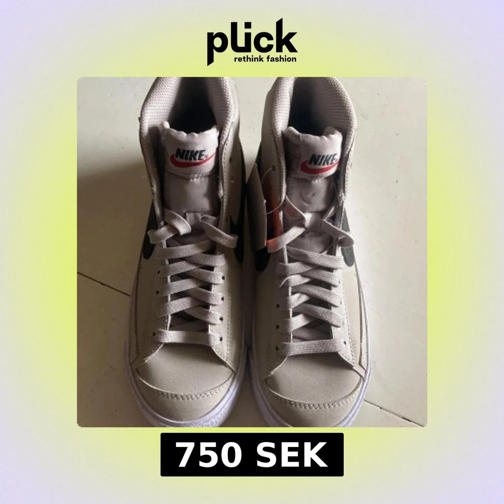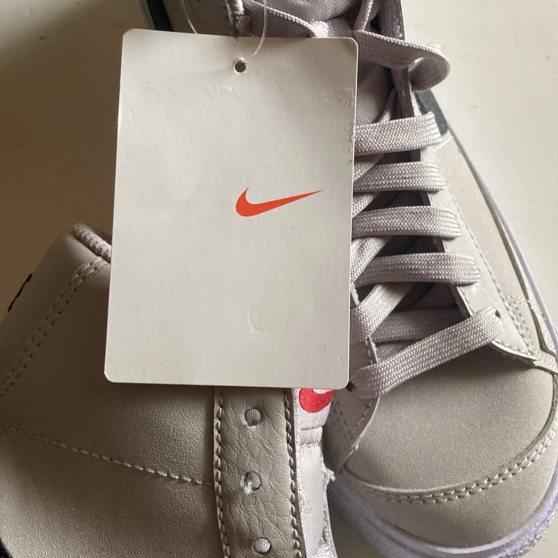 Nike Blazer Mid sneakers i beige med svart Swoosh och vit sula. Klassisk hög modell med snörning och retrovibbar. Ovandel i syntet och skinn, detaljerad med Nike-logga på plös och häl. Perfekta för dig som gillar stilrena och tidlösa sneakers.