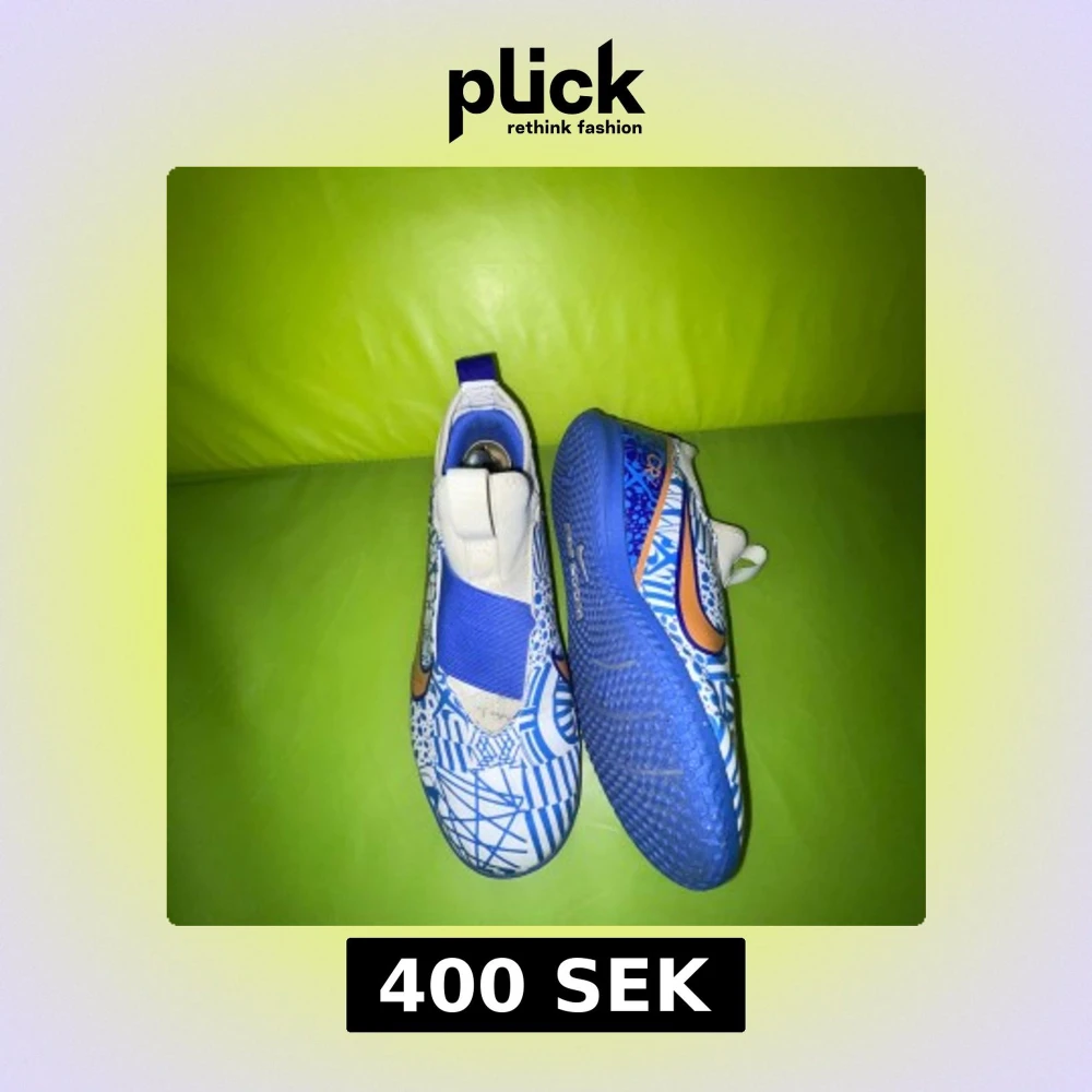 Säljer ett par Nike fotbollsskor med grymt blått och vitt grafiskt mönster och orange swoosh. Skorna har elastiskt band över vristen och blå sula med bra grepp. Perfekta för dig som vill sticka ut på planen!