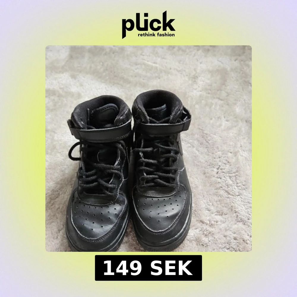 Säljer ett par svarta Nike Air force one sneakers i storlek 36. Skorna har en klassisk design med snörning och kardborreband för extra stöd. Perfekta för vardagsbruk med en stilren look.
