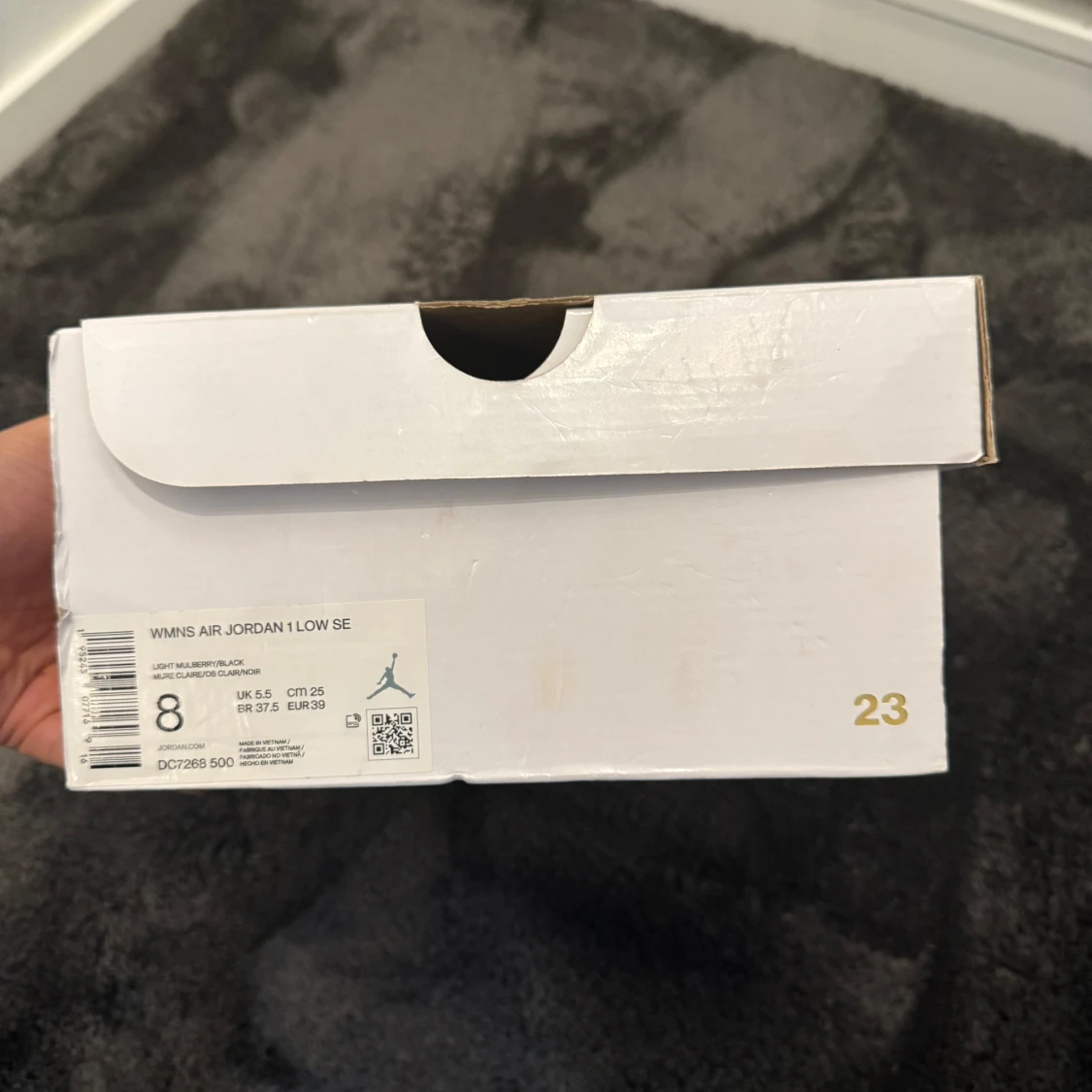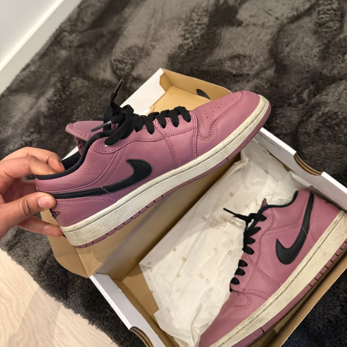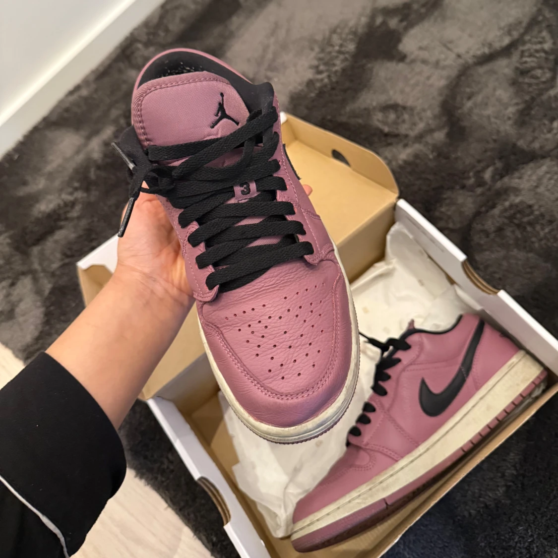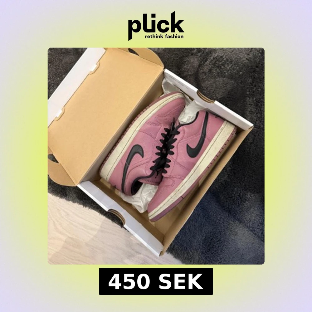 Säljer ett par Nike Air Jordan 1 Low SE i en snygg lila färg med svarta detaljer och vit sula. Skorna har klassisk låg siluett, svart swoosh och svarta skosnören. Perfekta för dig som vill sticka ut med dina sneakers. Använt skick