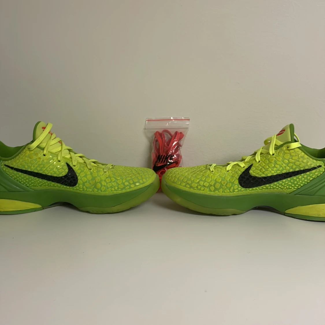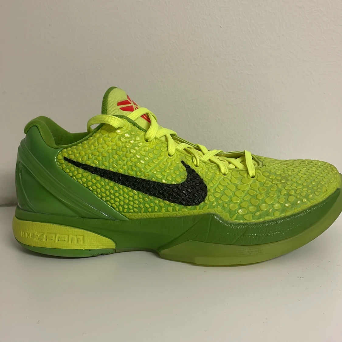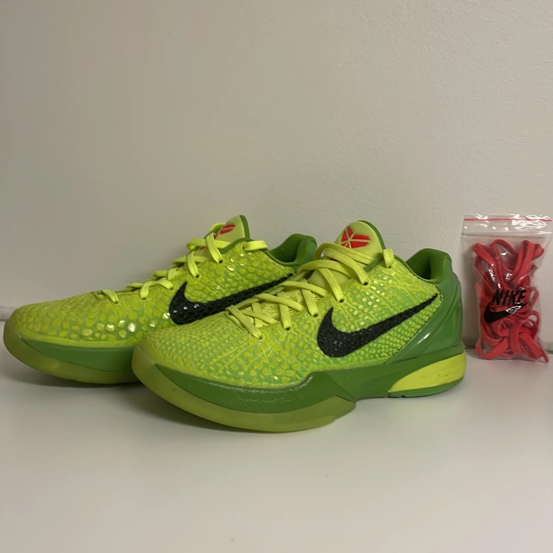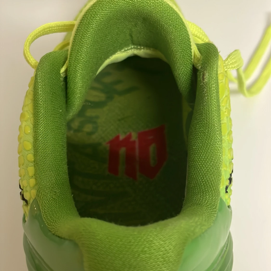 Gröna Kobe grinches basketskor. Andvänd 1 till 2 gånger. Kommer med extra röda sko snören. Pris kan diskuteras