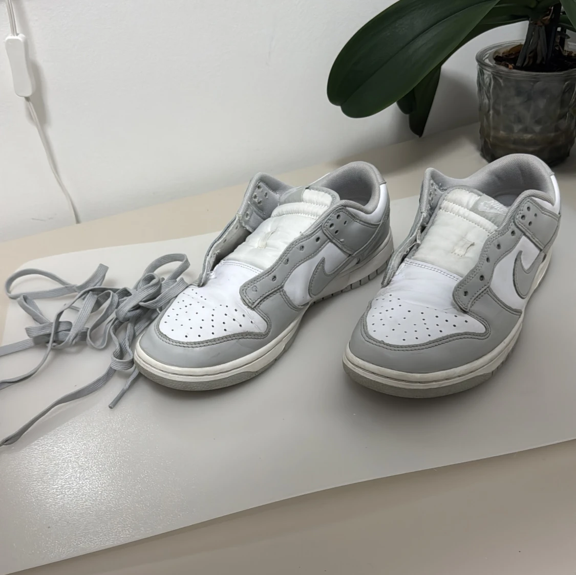 Snygga Nike Dunk sneakers i vitt och grått. Skorna har en klassisk design med snörning och Nike-logga på hälen. Perfekta för en stilren look. Lite använda kostar runt 1400 nya pris kan diskuteras