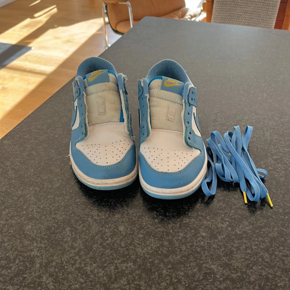 Nike Dunk Low sneakers i fräsch blå och vit färg med klassisk design. Skorna har perforerad tå, rund tå och platt sula. Medföljer matchande blå skosnören med gula detaljer. Ovandel i skinn och textil, ikonisk Nike-logga på sidan och tungan.