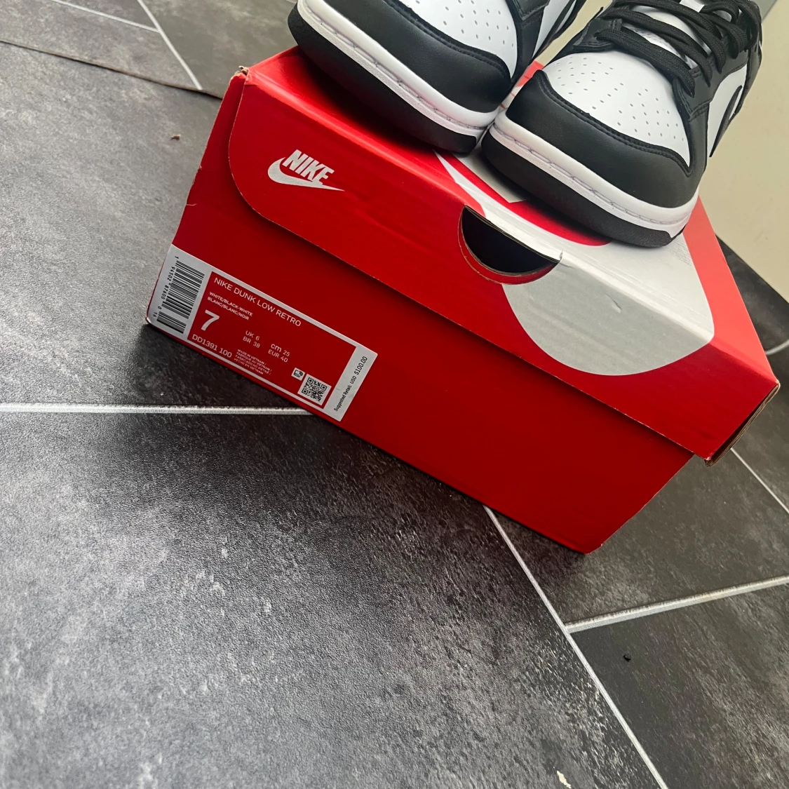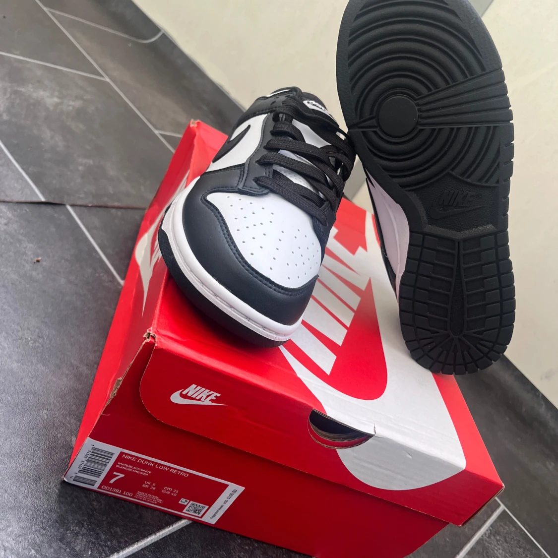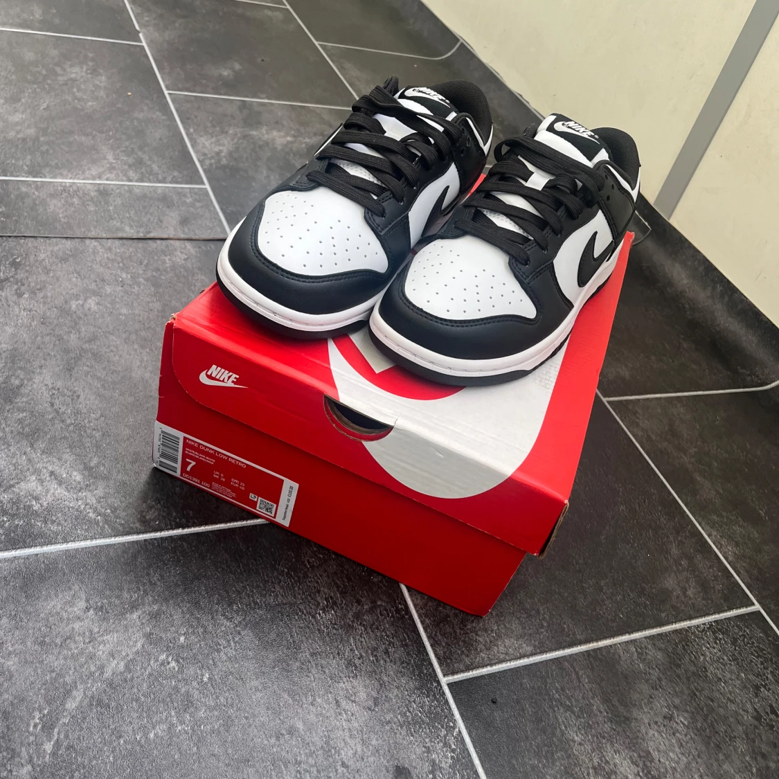 Säljer ett par Nike Dunk Low panda i klassisk svart och vit färg. Skorna är i nytt skick och kommer med originalkartong. Perfekta för både vardag och fest med sin stilrena design och bekväma passform. Skorna har snörning och en slitstark sula.