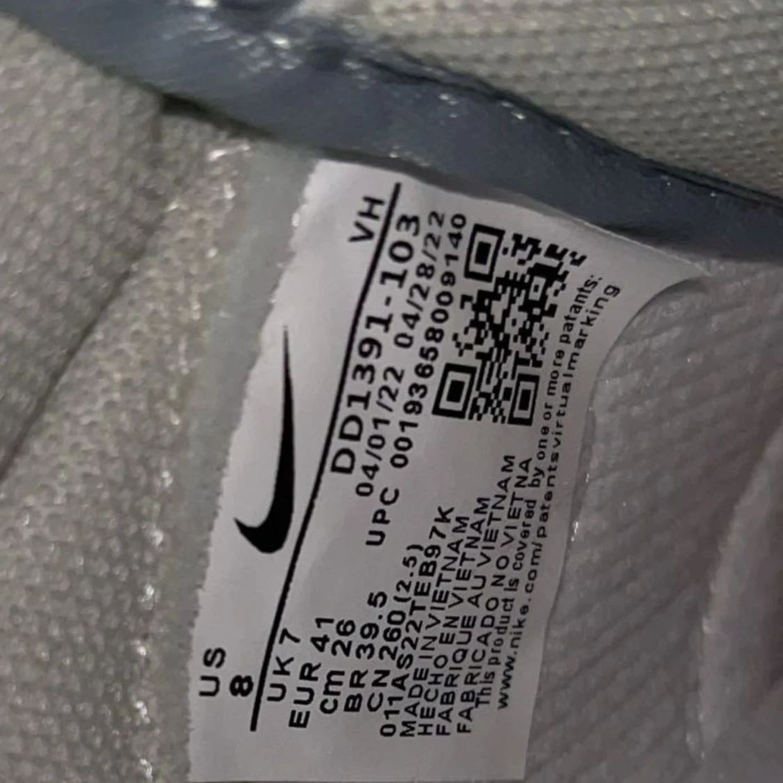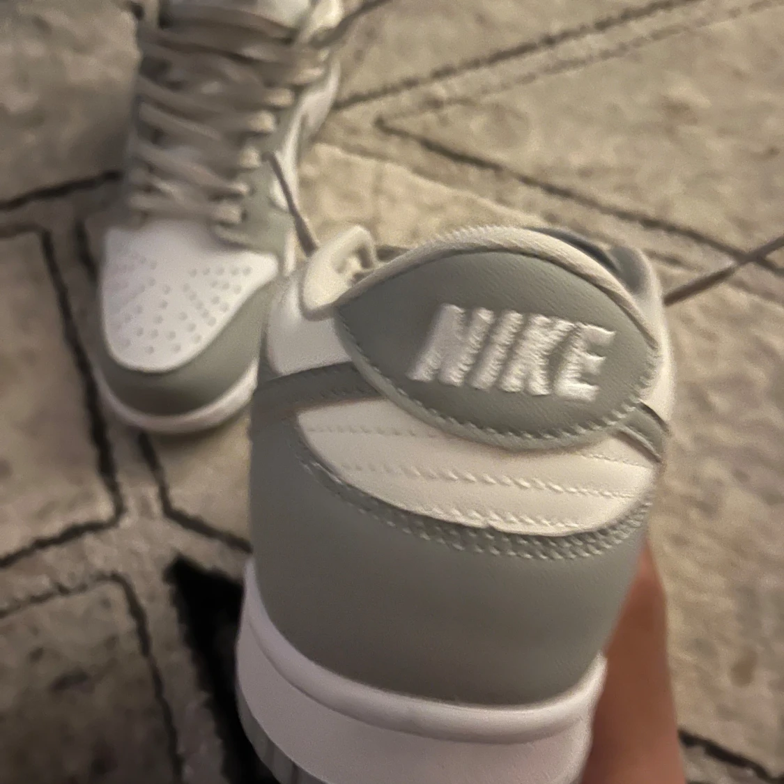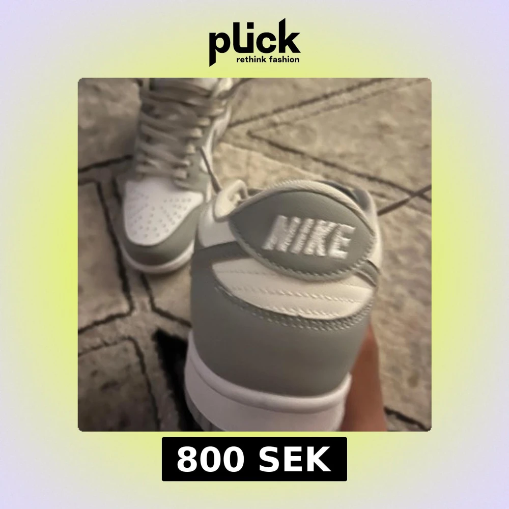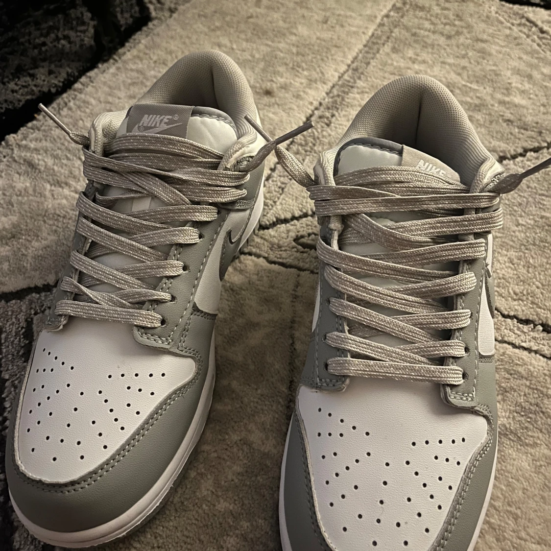 Säljer ett par Nike Dunk Low i stilren grå och vit färg. Skorna har klassisk design med perforerad tå, snörning och låg profil. Perfekta för dig som gillar sneakers med enkel och clean look.
