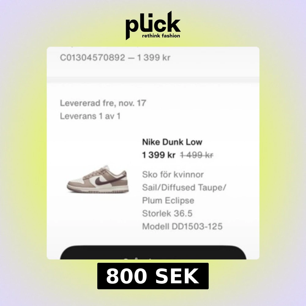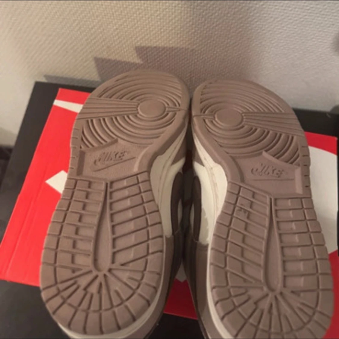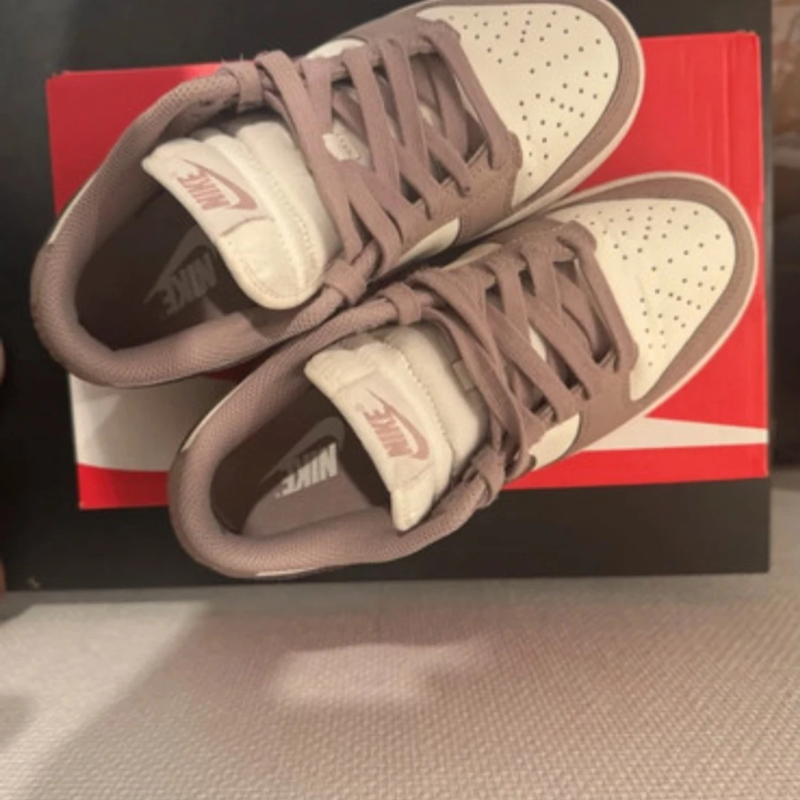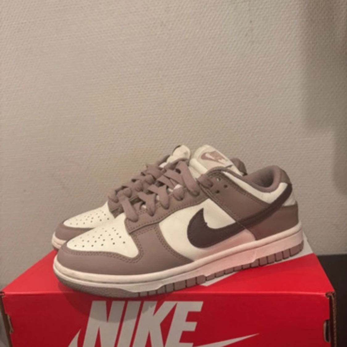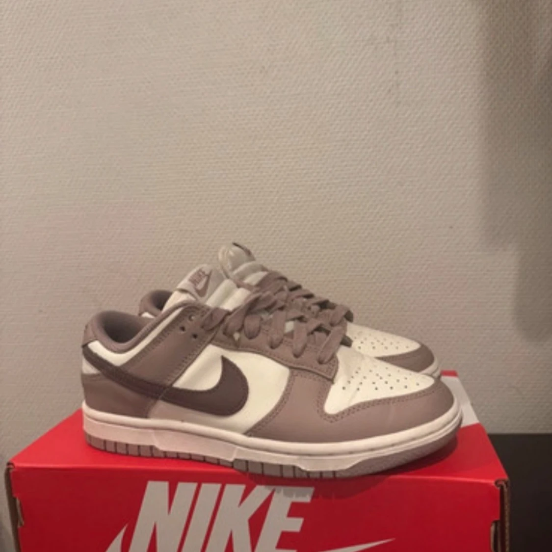 Nike Dunk Low i färgen Sail/Diffused Taupe/Plum Eclipse. Snygga sneakers med vit bas och taupe-bruna detaljer, klassisk swoosh och perforerad tå. Lågt skaft och snörning. Perfekta för dig som vill ha en clean och trendig look. Använda fåtal gånger men rengjorda och utan skador. Köpta på Nikes officiella hemsida. Ett släpp och säljs inte fler.
