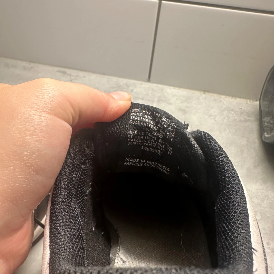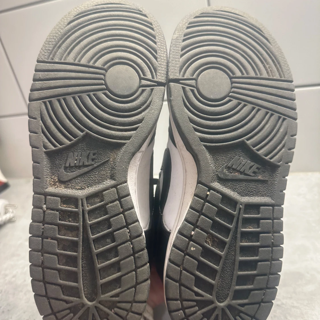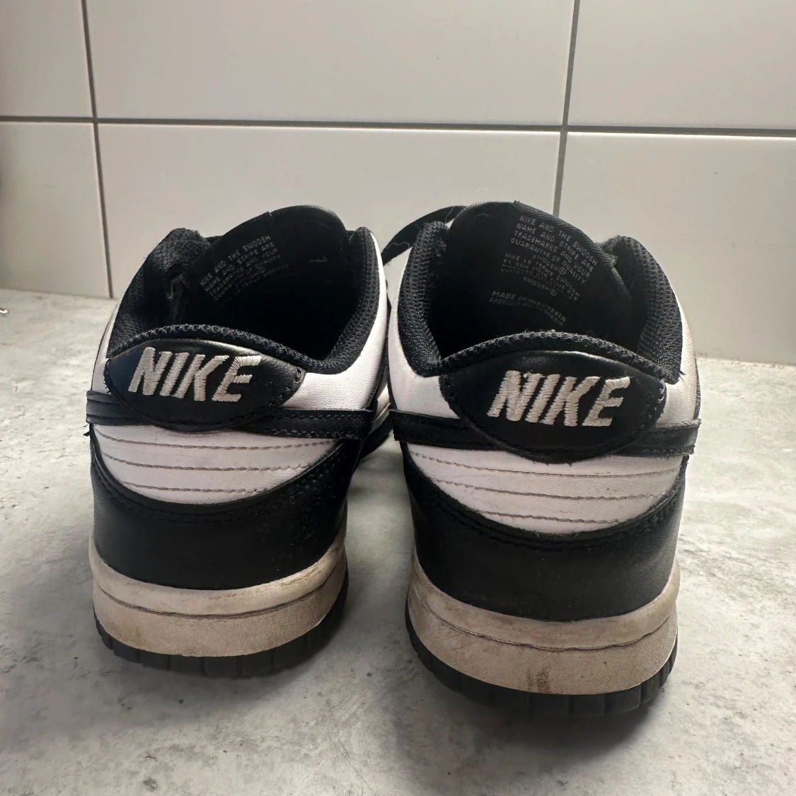 Nike Dunk Low i svart och vitt. Skorna är i bra skick med normala användningsmärken.