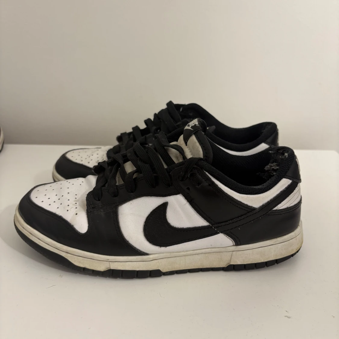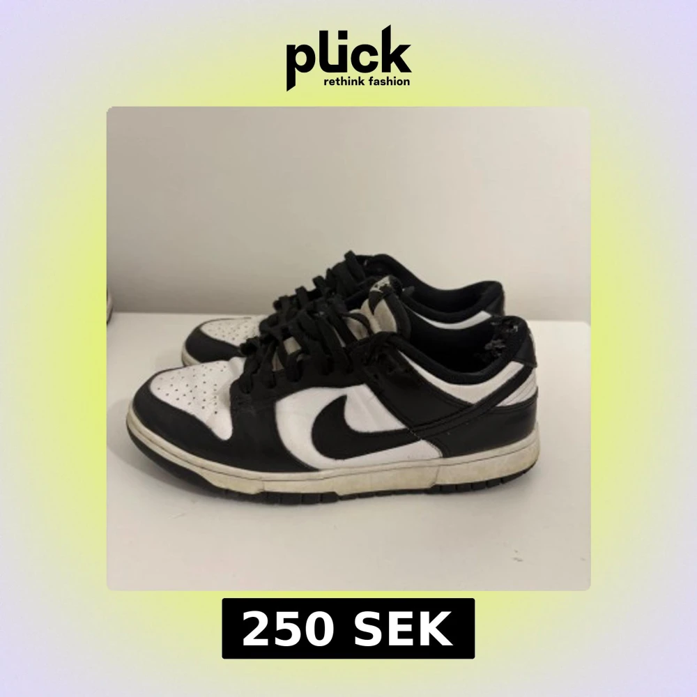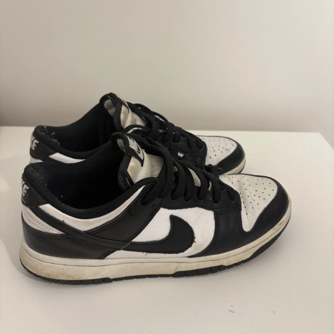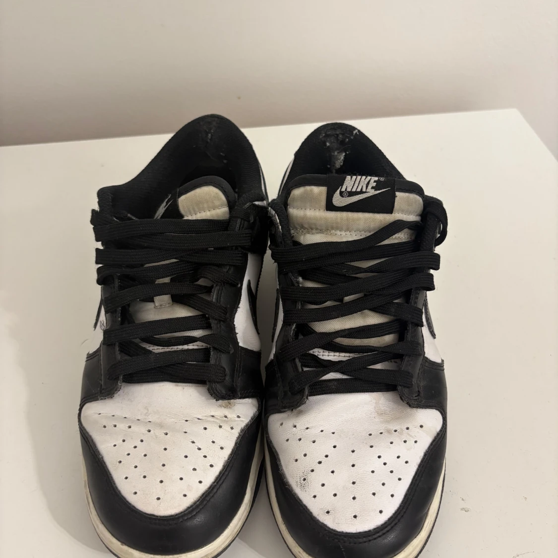 Svarta och vita Nike Dunk Low sneakers med klassisk svart swoosh på sidan. Skorna har snörning, perforerad tå och platt sula. Stilren färgkombination som passar till det mesta. Ovandelen är i skinn och textil, med lågt skaft och svartvit design.
