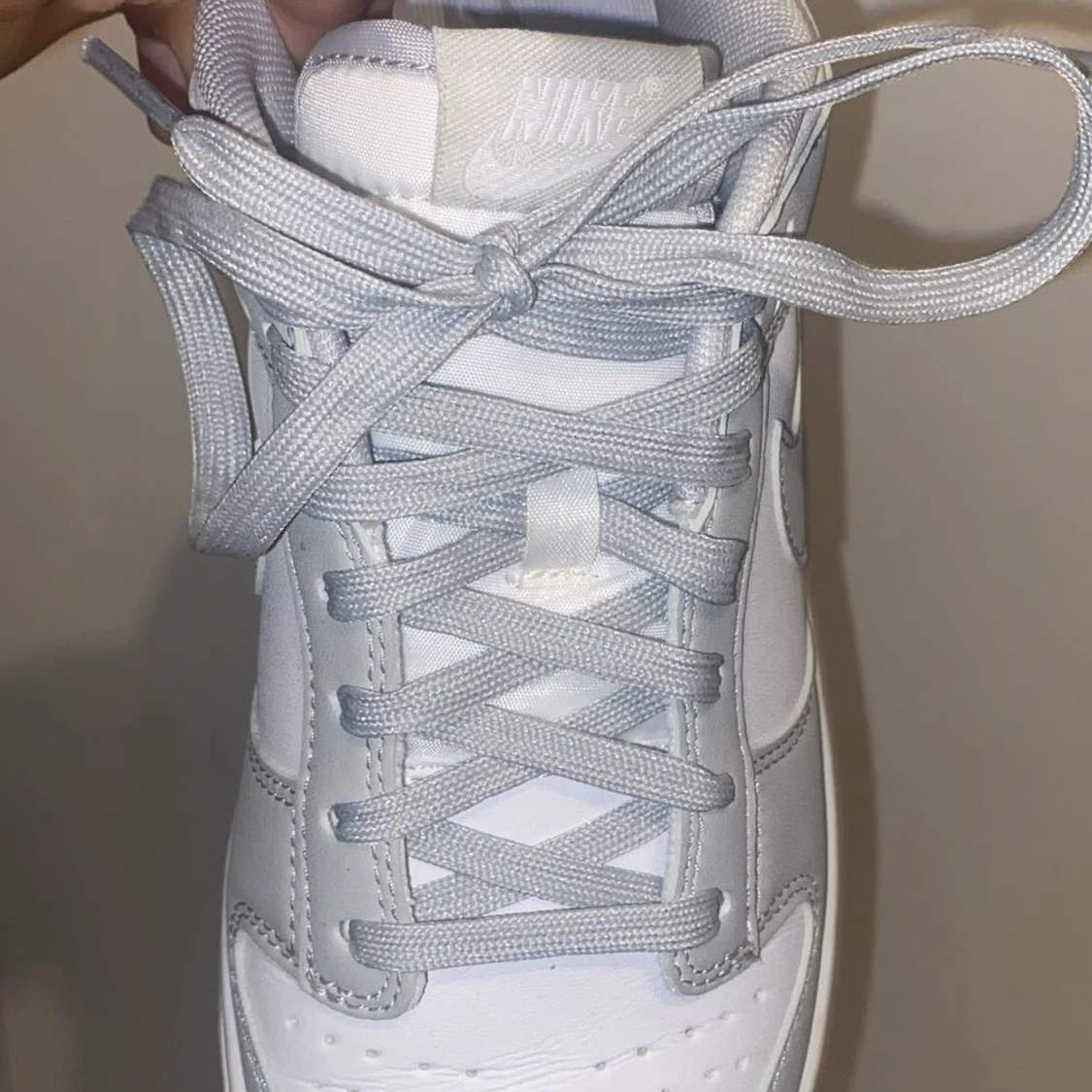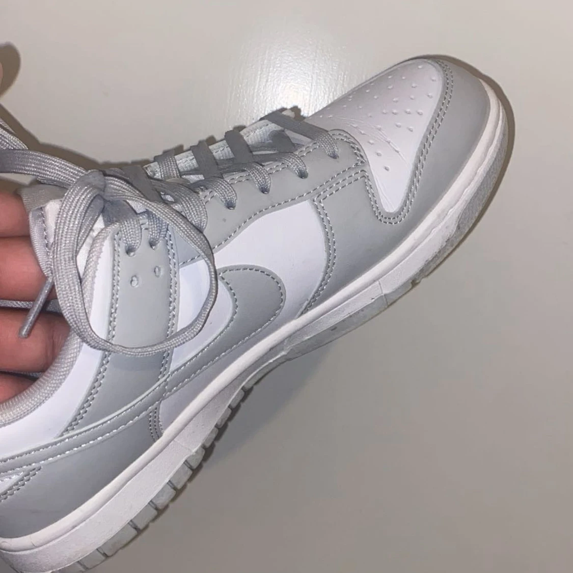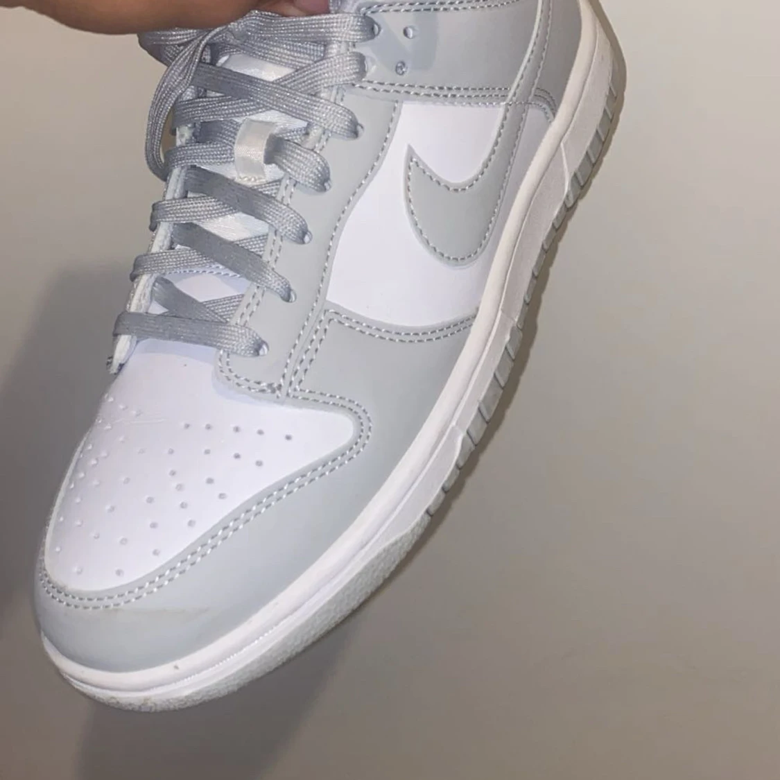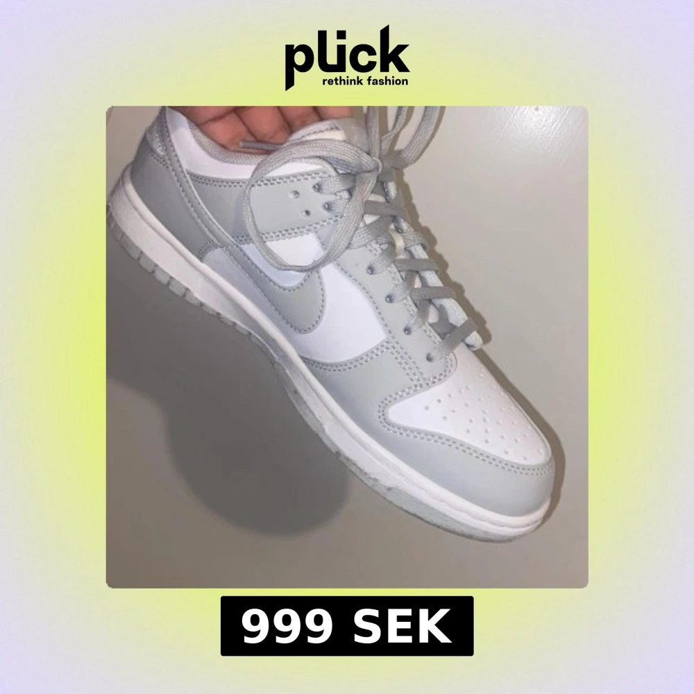 Nike Dunk Low sneakers i fräscht vitt och ljusgrått skinn. Klassisk siluett med rund tå, perforerad tåbox och platt sula. Snygga grå skosnören och ikoniska Swoosh-loggan på sidan. Perfekta för dig som gillar stilrena och cleana sneakers.