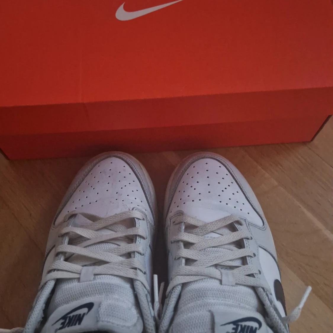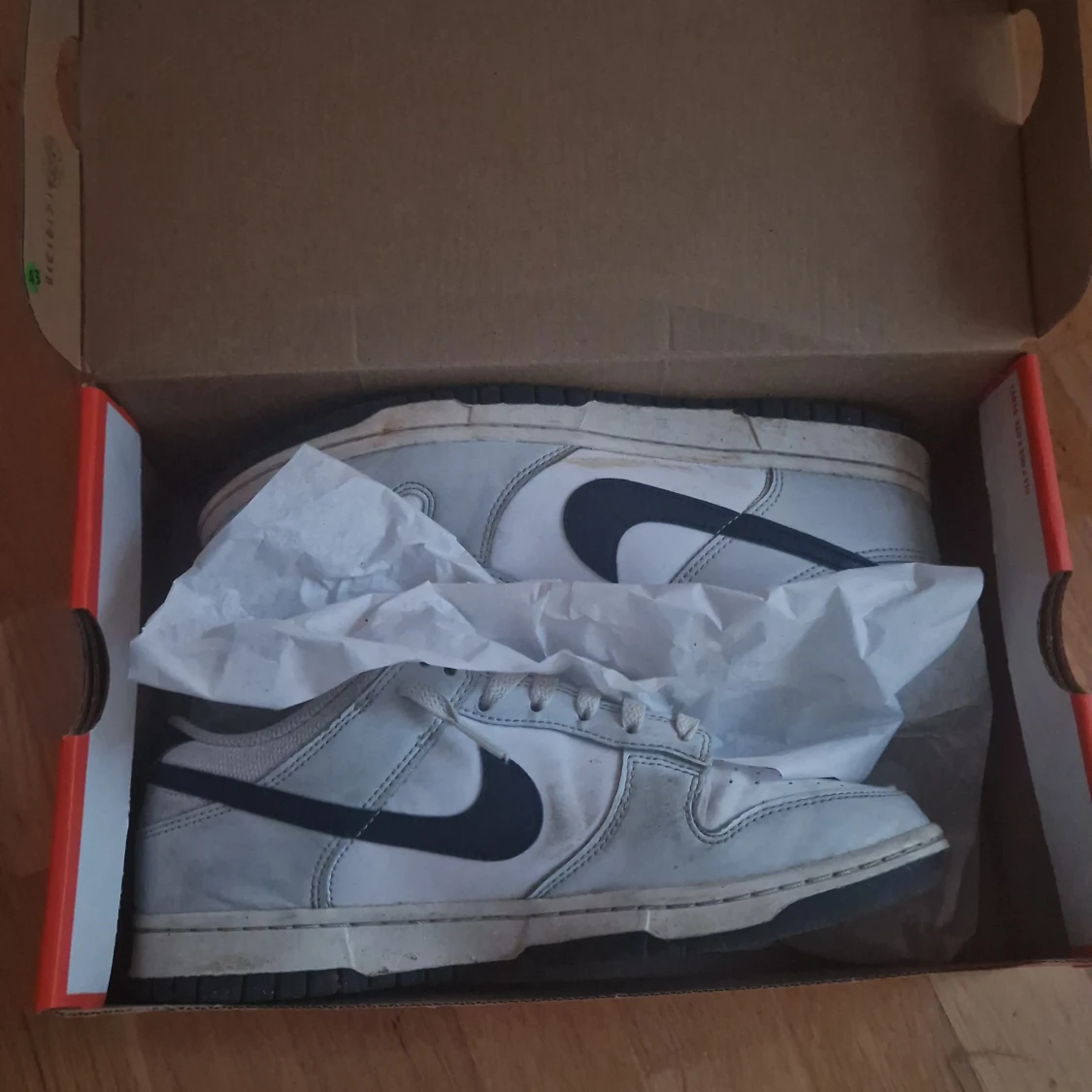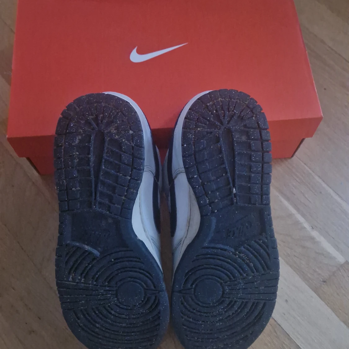 Nike Dunk Low sneakers i vit och marinblå färg med klassisk snörning och perforerad tå. Skorna har en rund tå och platt sula, med Nike-logga på sidan och tungan. Ovandelen är i skinn och insidan har en cool blomdetalj på sulan. Perfekt för dig som gillar streetstyle.