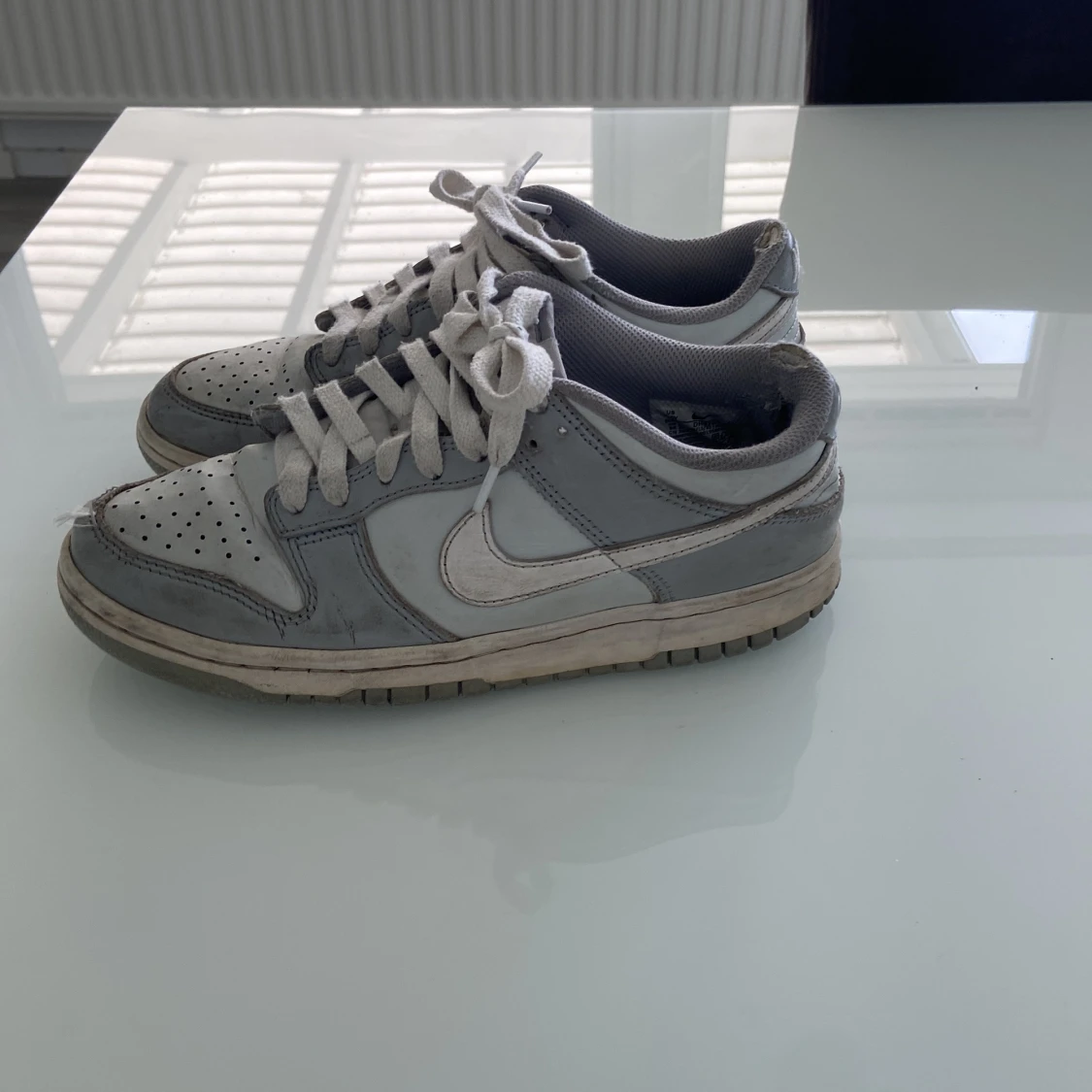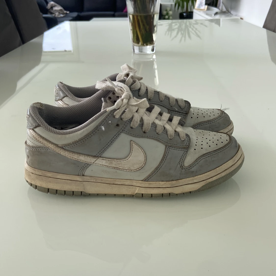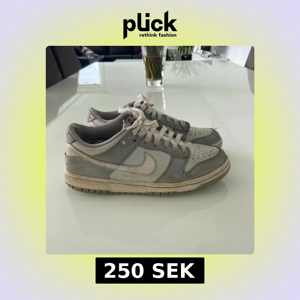 Nike Dunk sneakers i grått och vitt med klassisk låg profil. Skorna har snörning, rund tå och platt sula. Perfekta för dig som gillar en stilren och sportig look. Swoosh-logga på sidorna och Nike-brodyr på hälen.