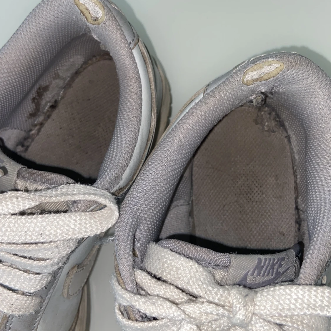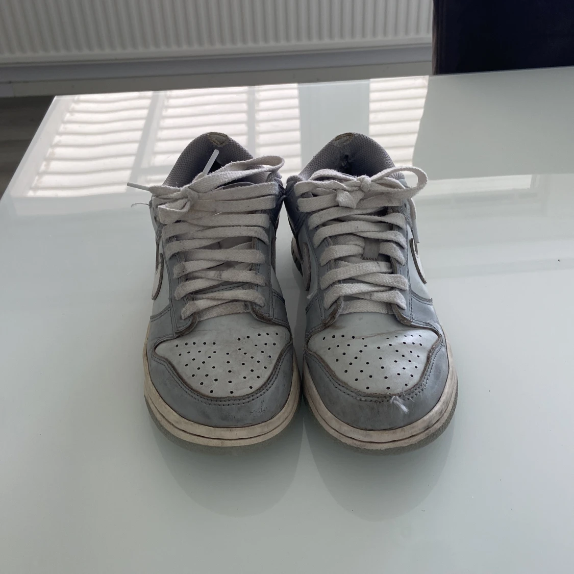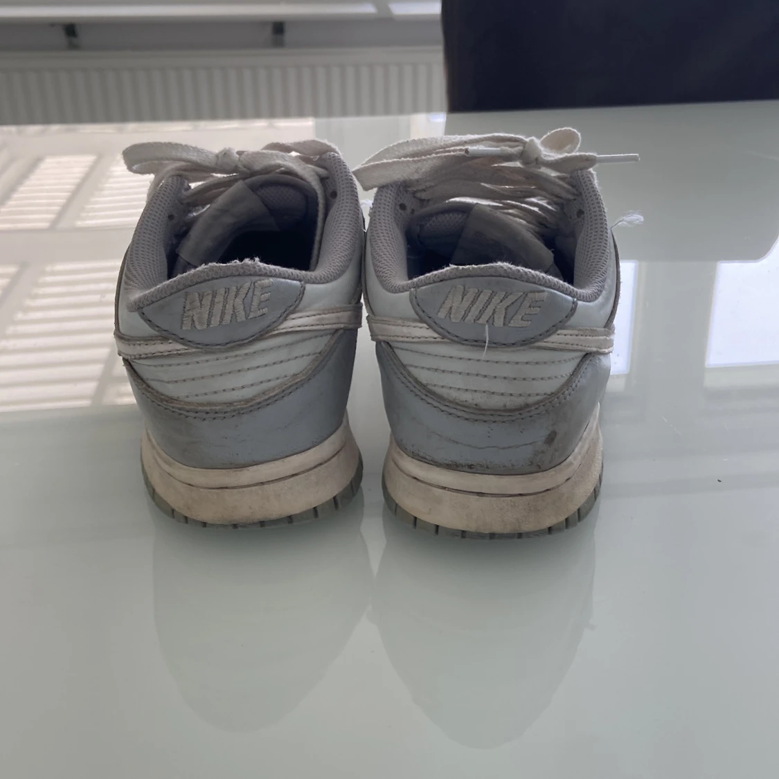 Nike Dunk sneakers i grått och vitt med klassisk låg profil. Skorna har snörning, rund tå och platt sula. Perfekta för dig som gillar en stilren och sportig look. Swoosh-logga på sidorna och Nike-brodyr på hälen.
