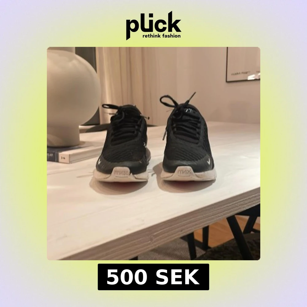 Säljer ett par svarta Nike Air Max 270 sneakers med vita detaljer och stor synlig Air Max-sula. Skorna har snörning, mesh-överdel och en chunky platt sula som ger en sportig vibe. Perfekta för dig som gillar streetstyle och bekväma skor.