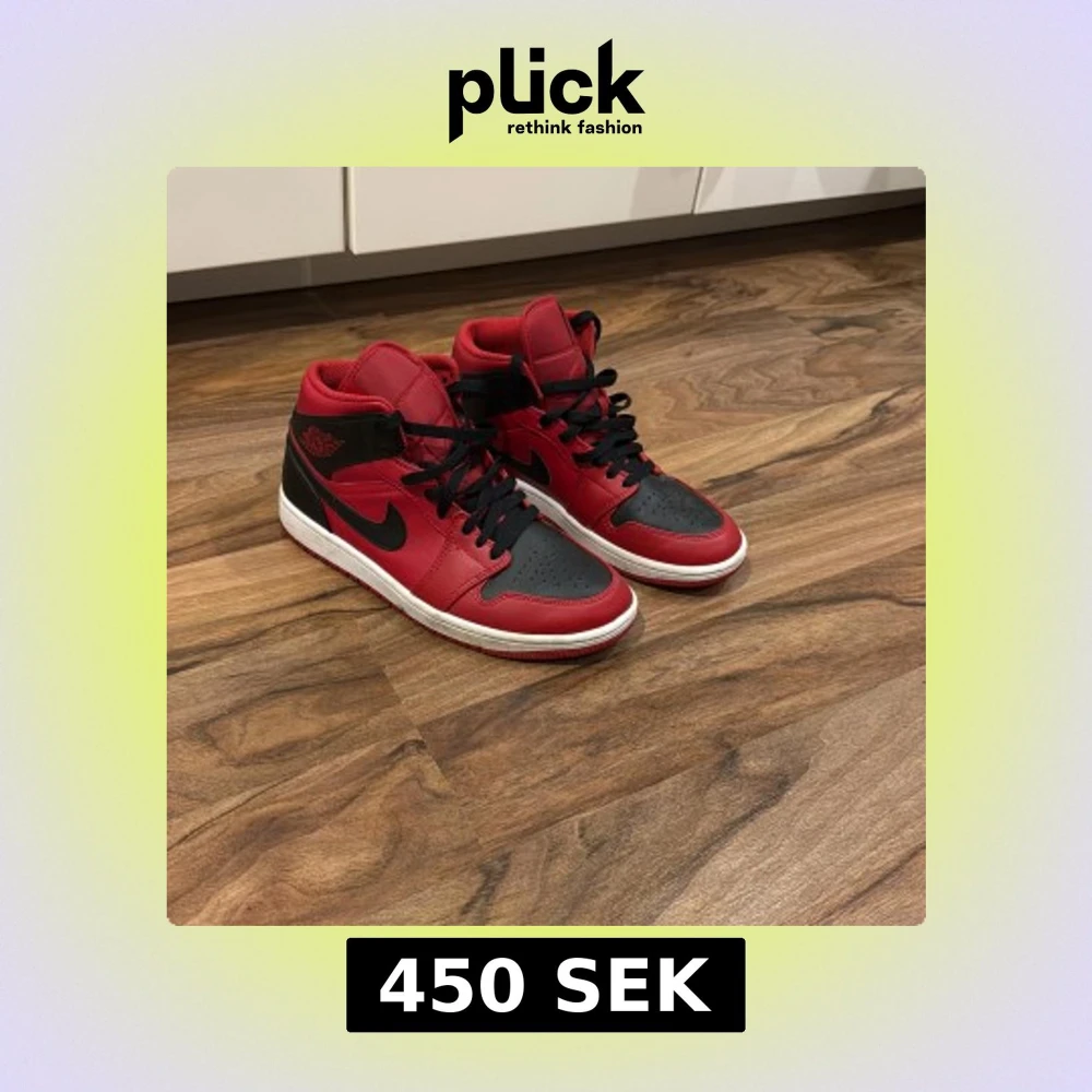Säljer ett par Nike Air Jordan 1 Mid i klassisk röd och svart färg med vita sulor. Skorna har svart snörning, rund tå och ikoniska Jordan-loggan på sidan och tungan. Tillverkade i skinn och syntet, perfekta för dig som vill sticka ut med en tidlös sneaker.