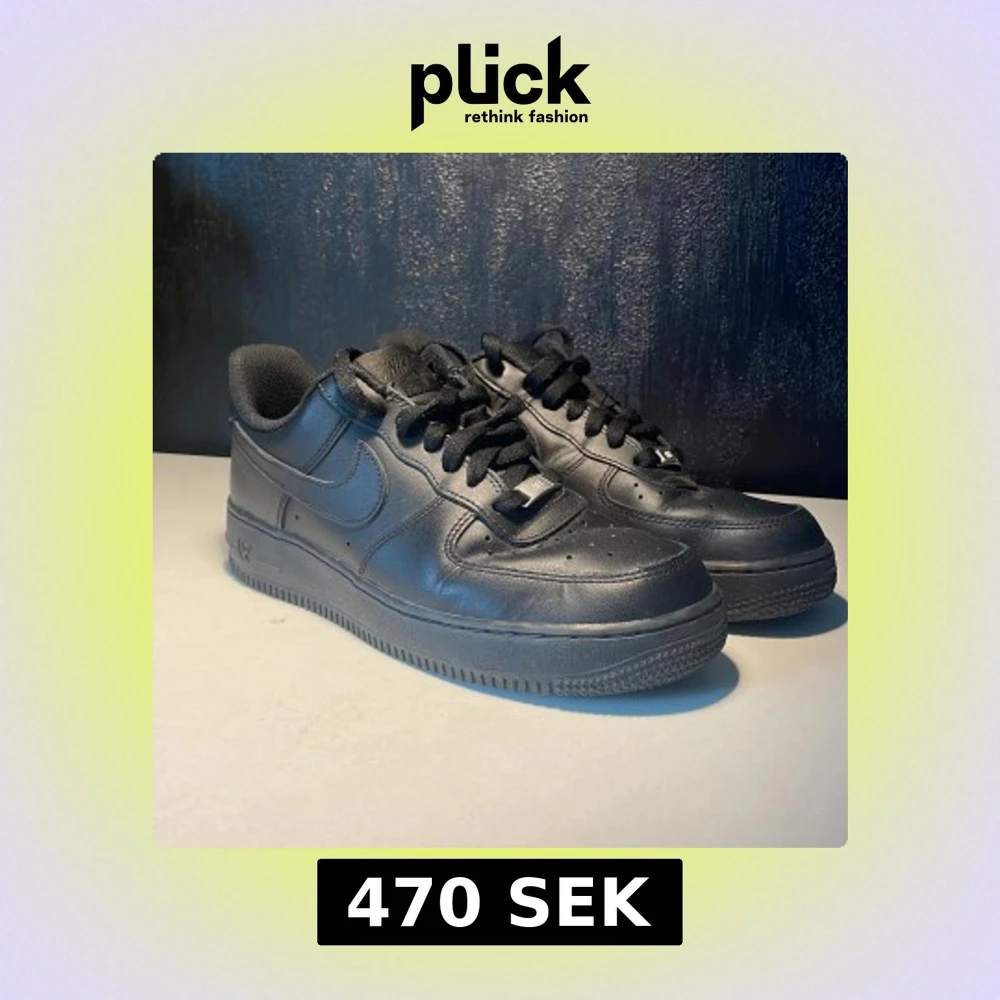 Svarta Nike Air Force 1 sneakers med klassisk låg siluett och platt sula. Skorna har snörning med metallbricka märkt 'AF1', rund tå och är tillverkade i skinn med textilfoder. Swoosh-logga på sidan och Nike Air broderat på hälen. Perfekt för dig som gillar stilrena och ikoniska sneakers.Pris kan diskuteras!