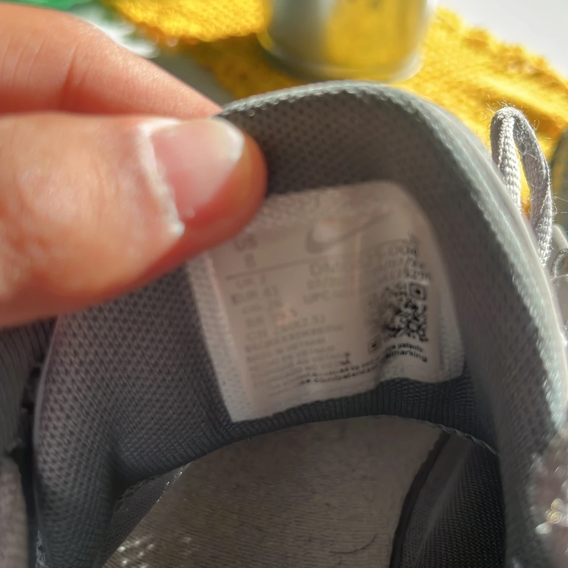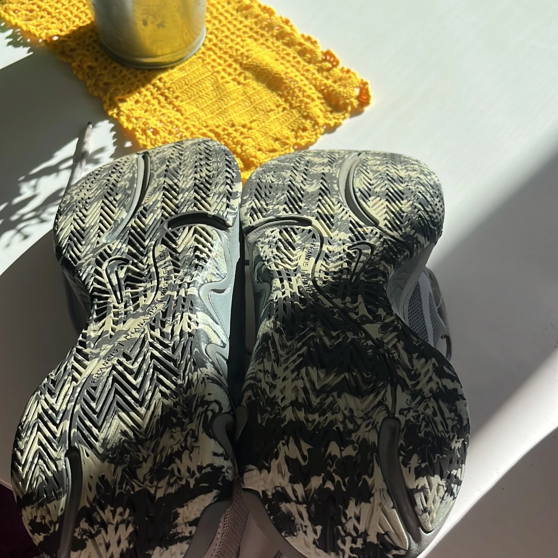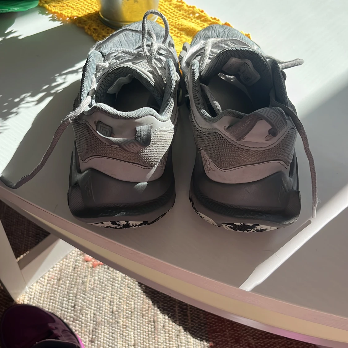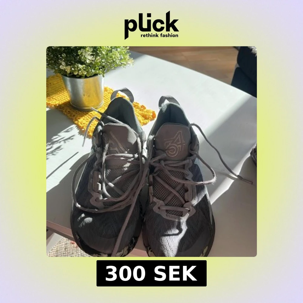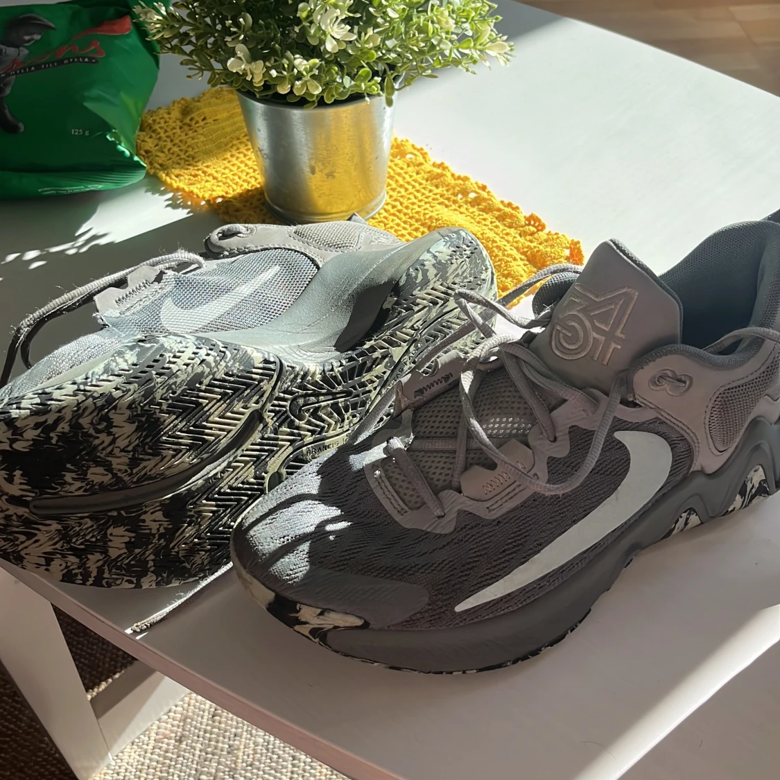 Säljer ett par grå Nike sneakers med coolt 34-märke på plösen och vit swoosh på sidan. Skorna har snörning, mesh- och syntetmaterial samt en unik svartvit mönstrad sula. Perfekta för dig som gillar basket och vill sticka ut lite extra på planen.